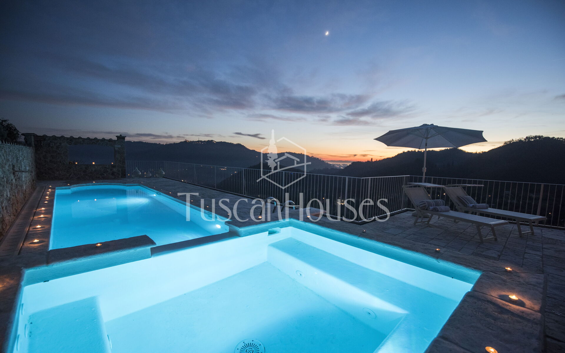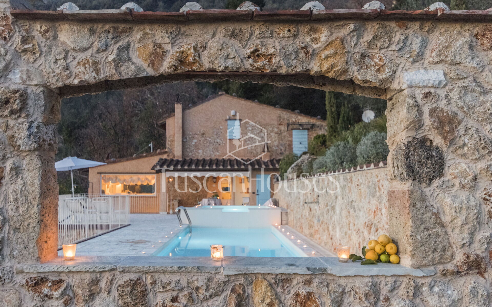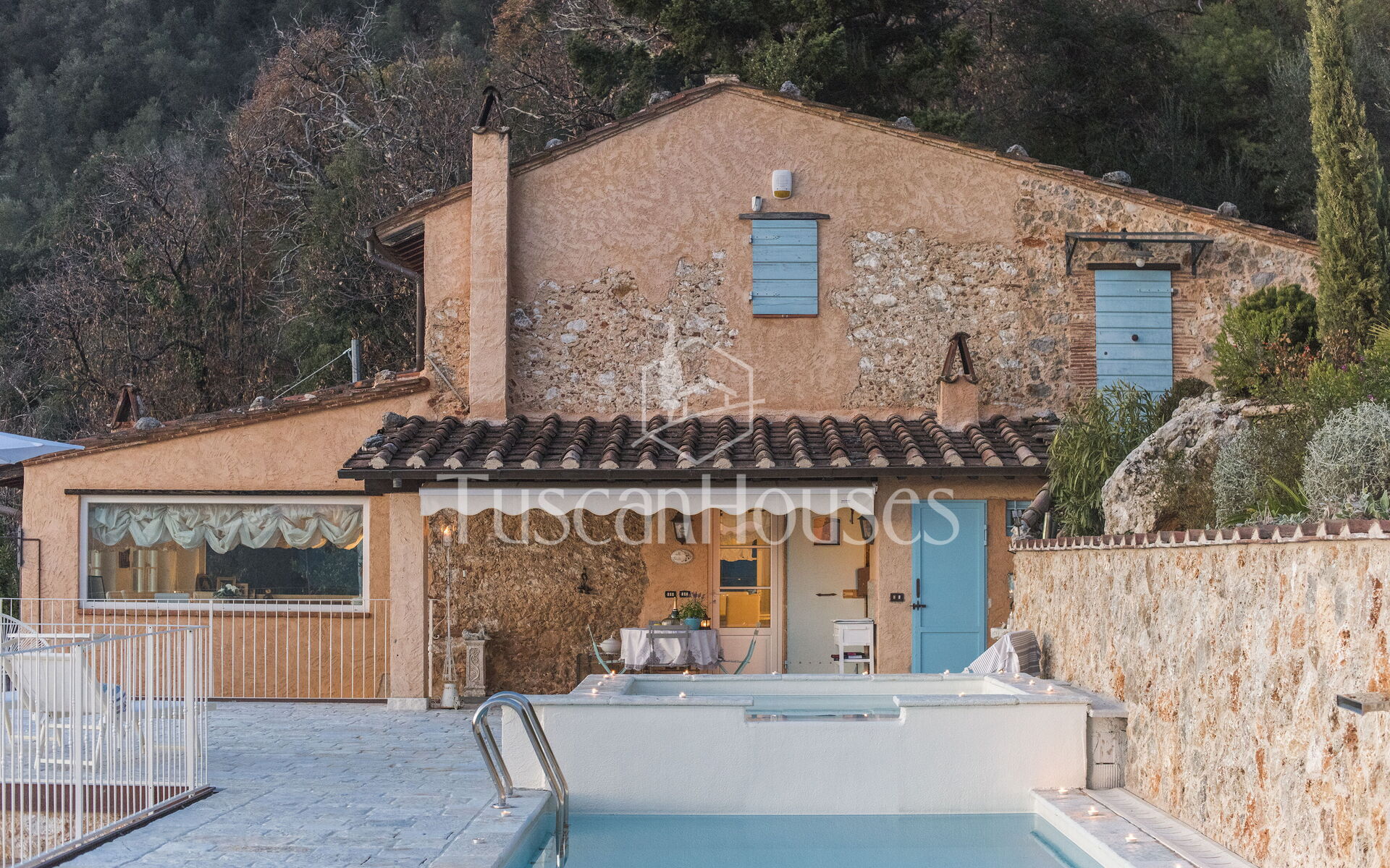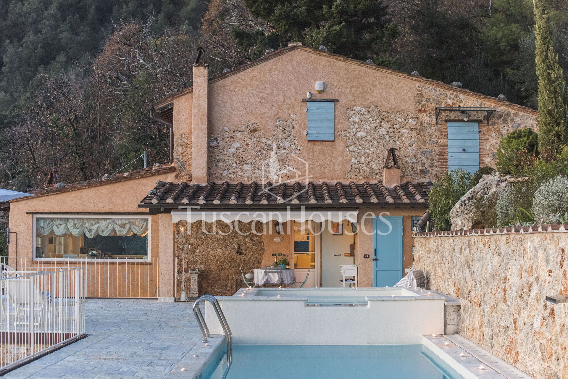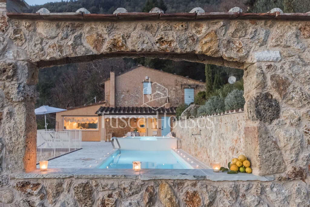 La piscina privata, nascosta in un angolo riservato del giardino, invita a rilassarsi sotto il sole toscano, mentre il patio diventa lo scenario perfetto per cene all’aperto e tramonti indimenticabili sulla valle.