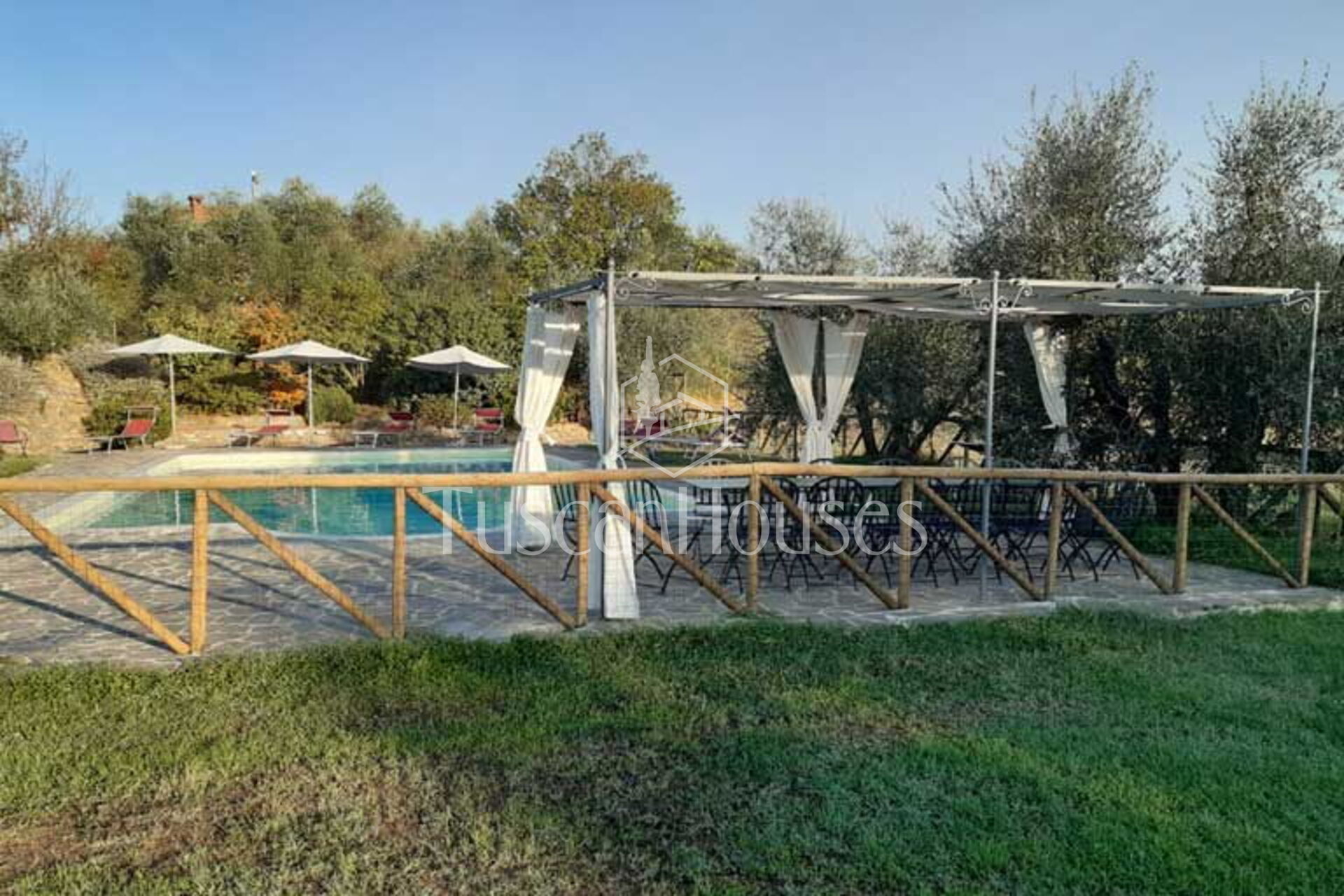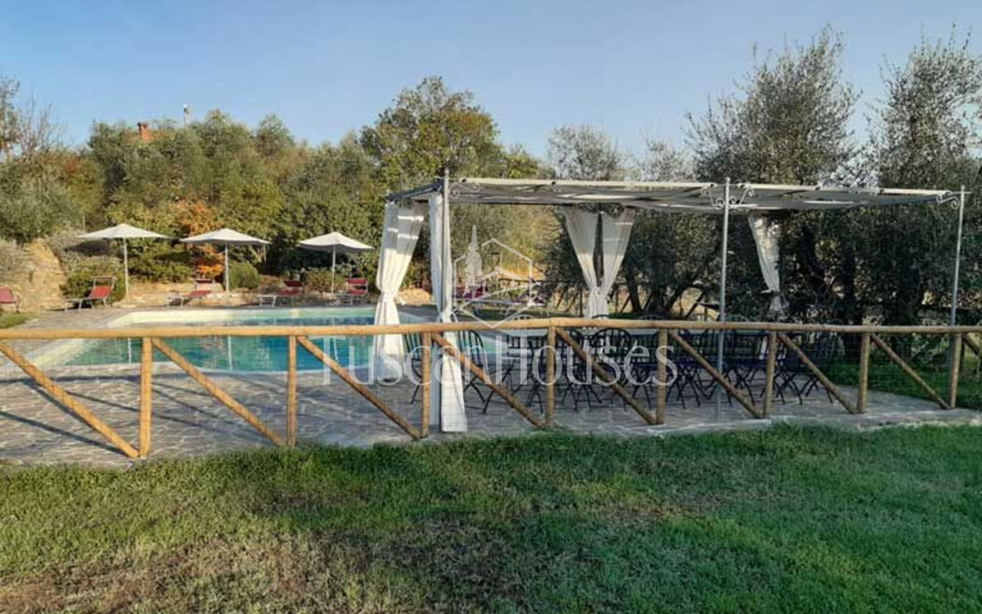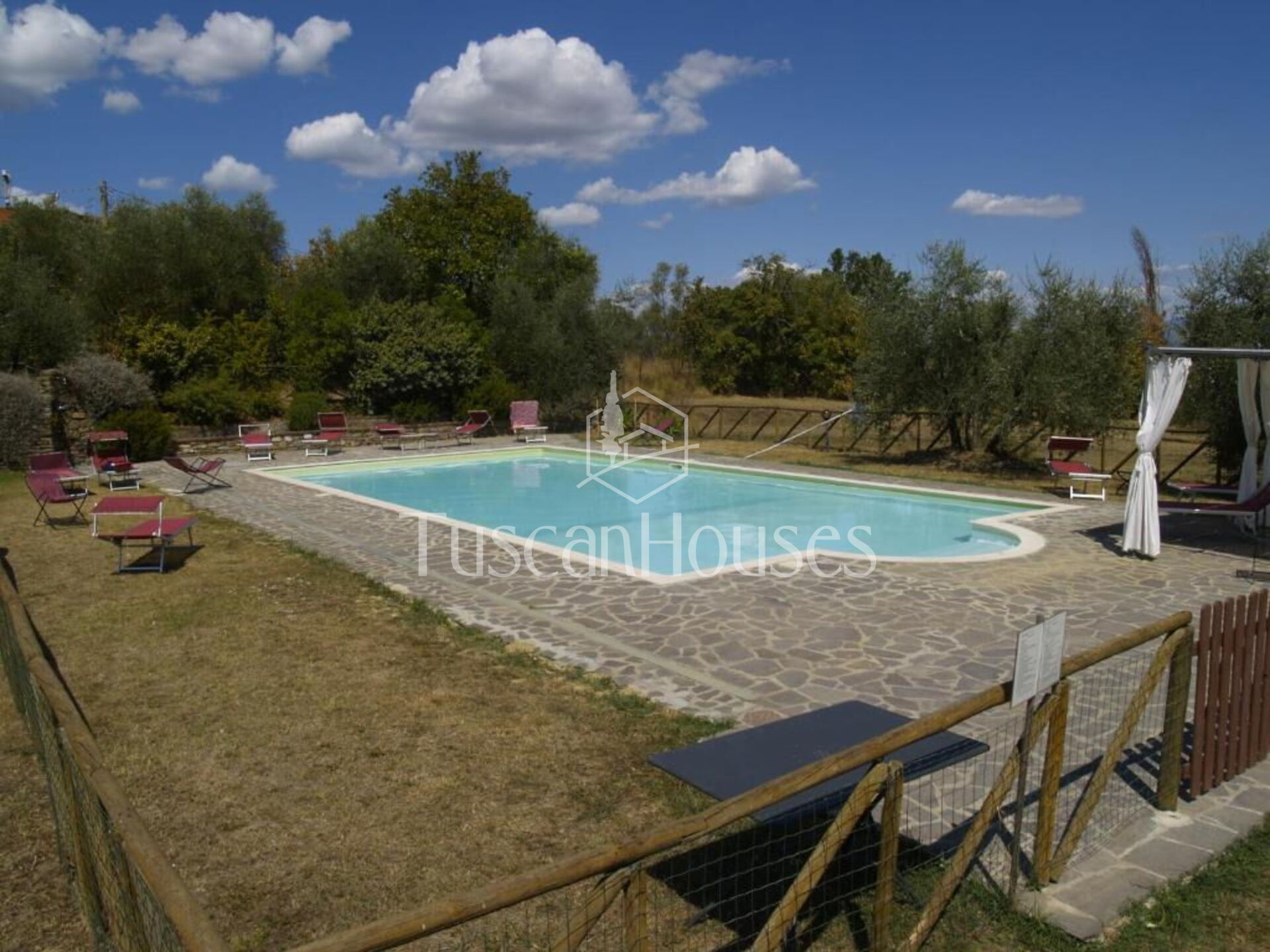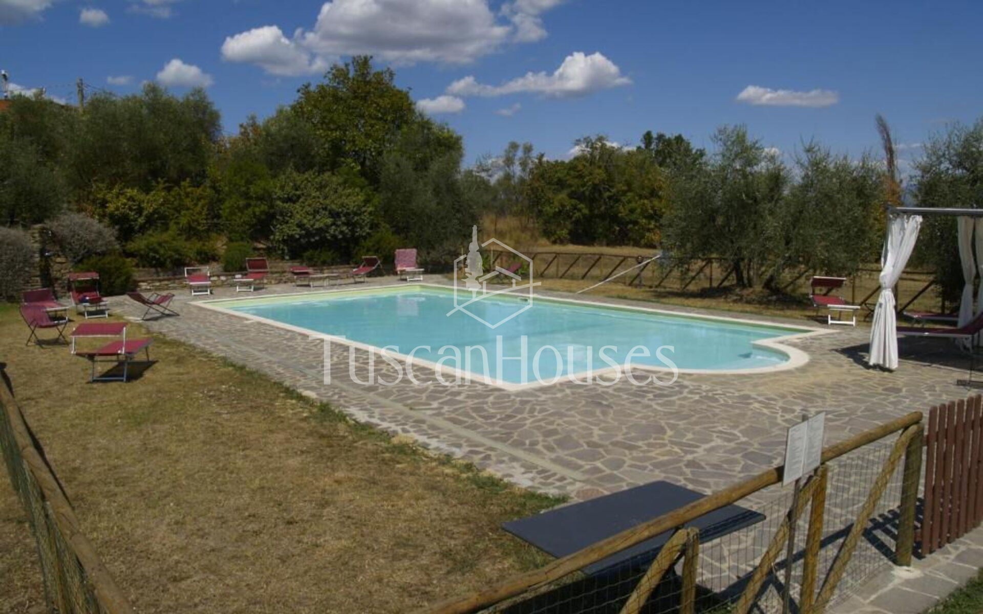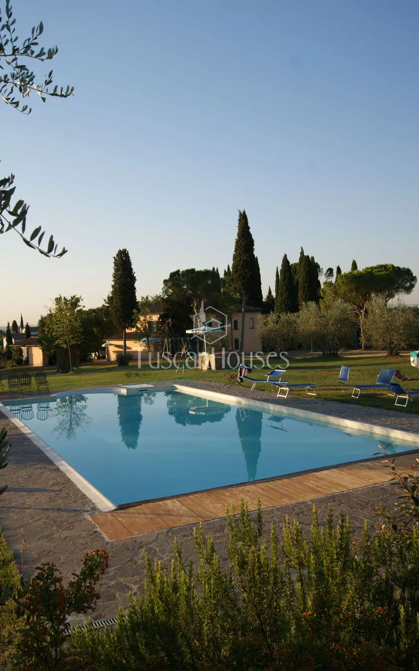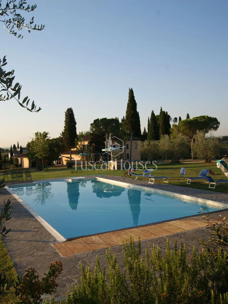 The villa is surrounded by a two-hectare garden with meadows, olive trees and a natural wood of ash, oaks and old cypresses. A large swimming pool completely fenced, completes this scenic part of the Chiana Valley.