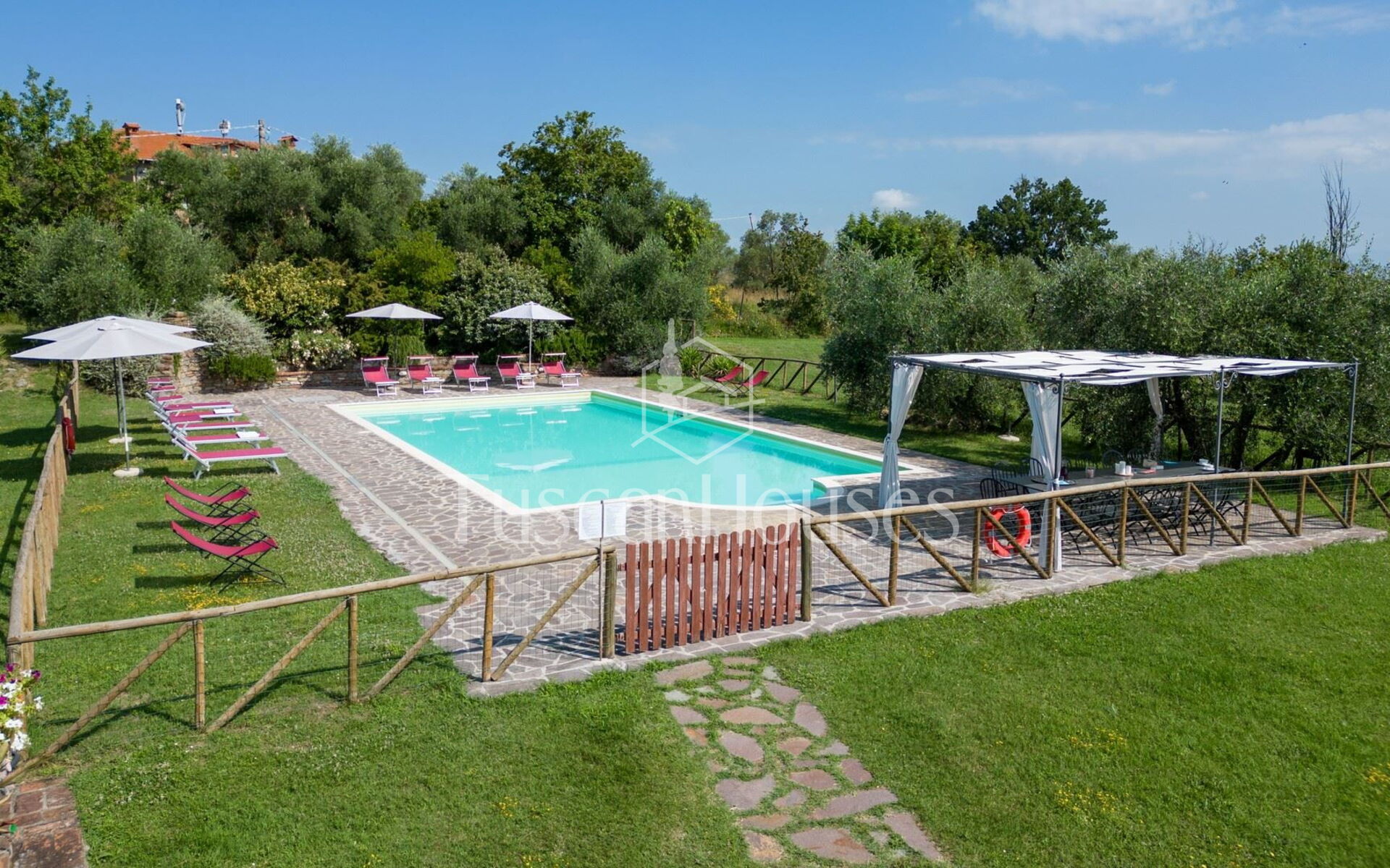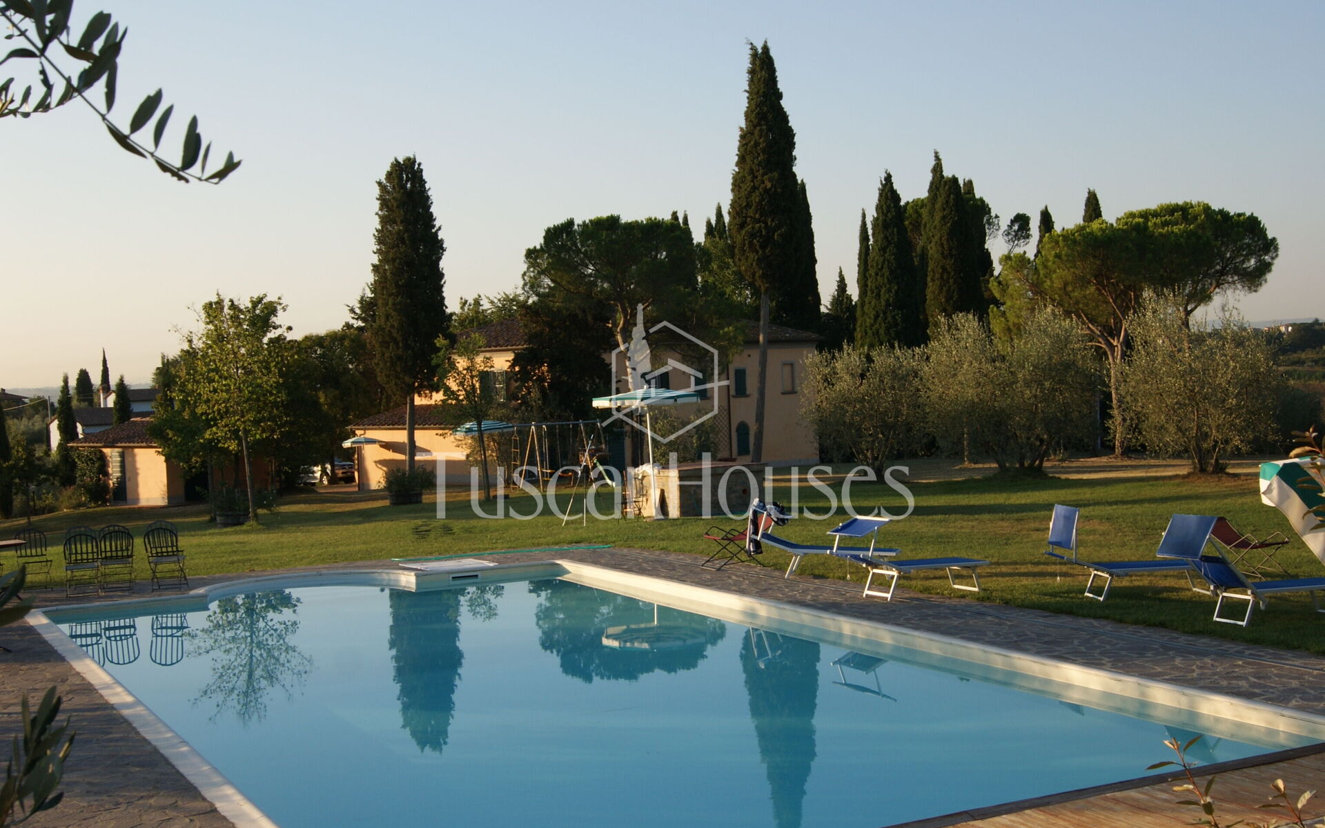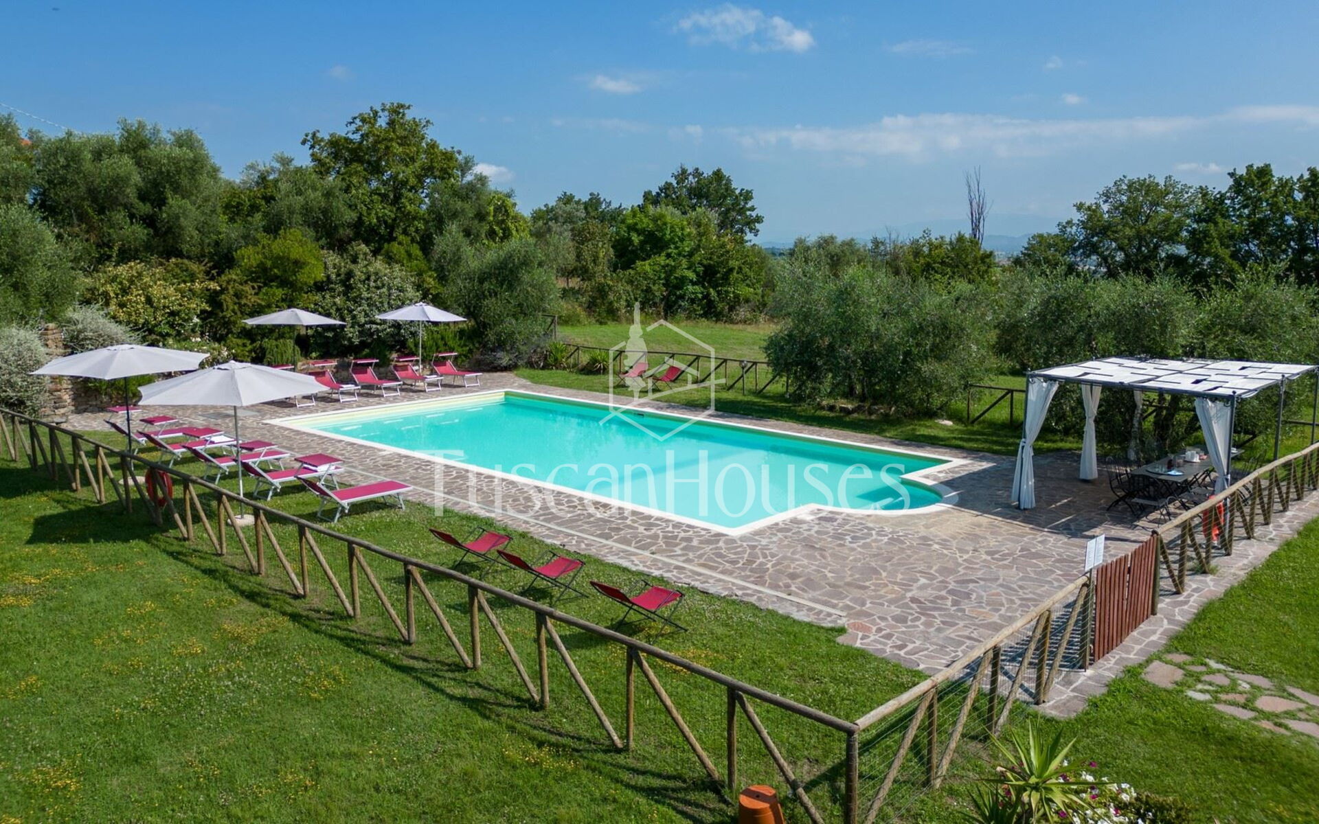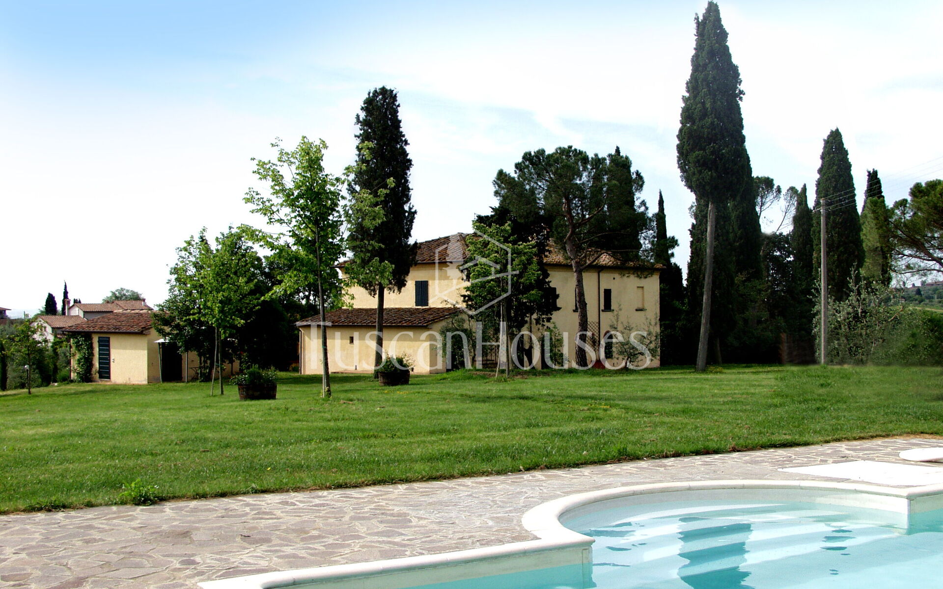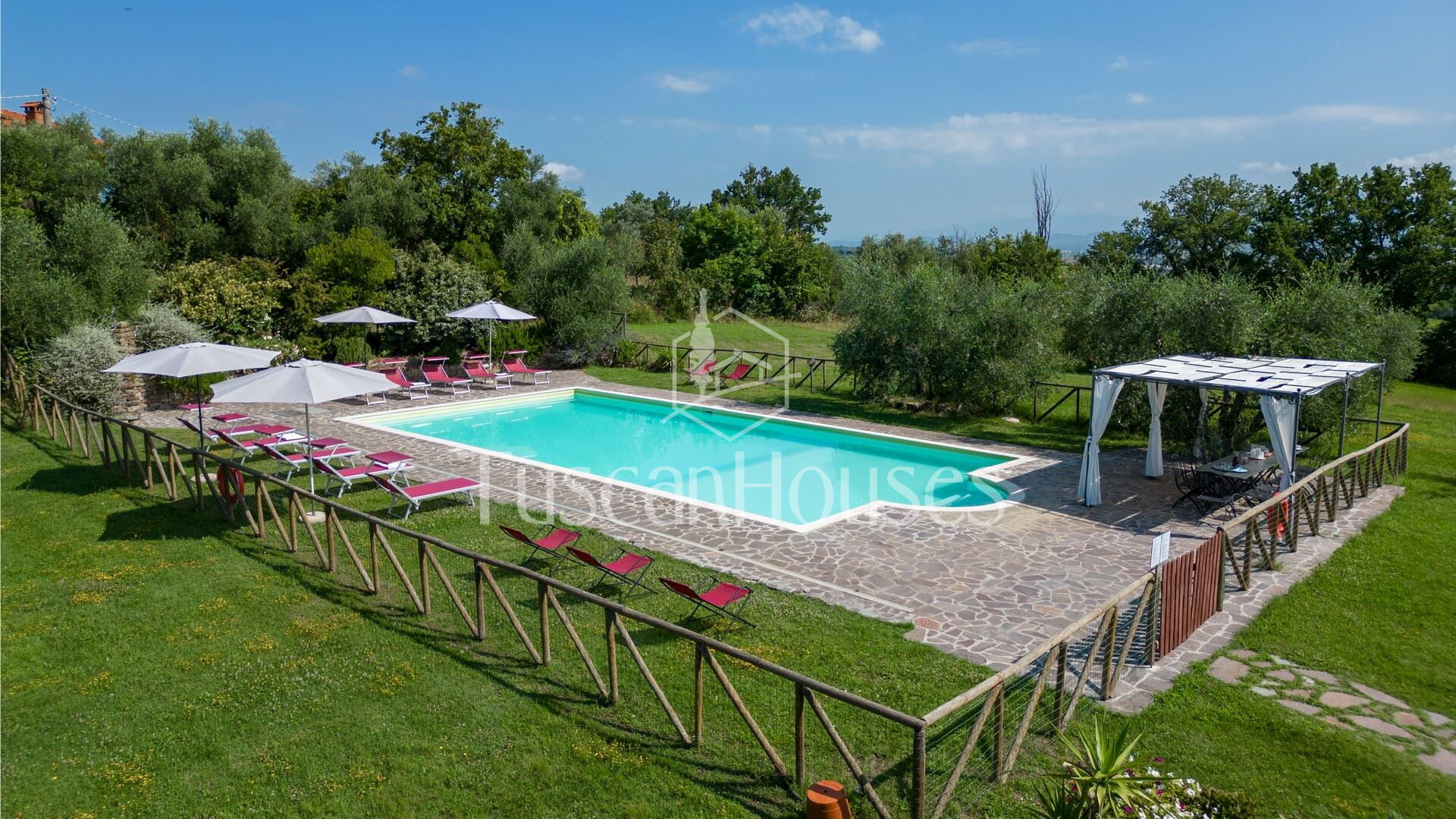 The villa is surrounded by a two-hectare garden with meadows, olive trees and a natural wood of ash, oaks and old cypresses. A large swimming pool completely fenced, completes this scenic part of the Chiana Valley.