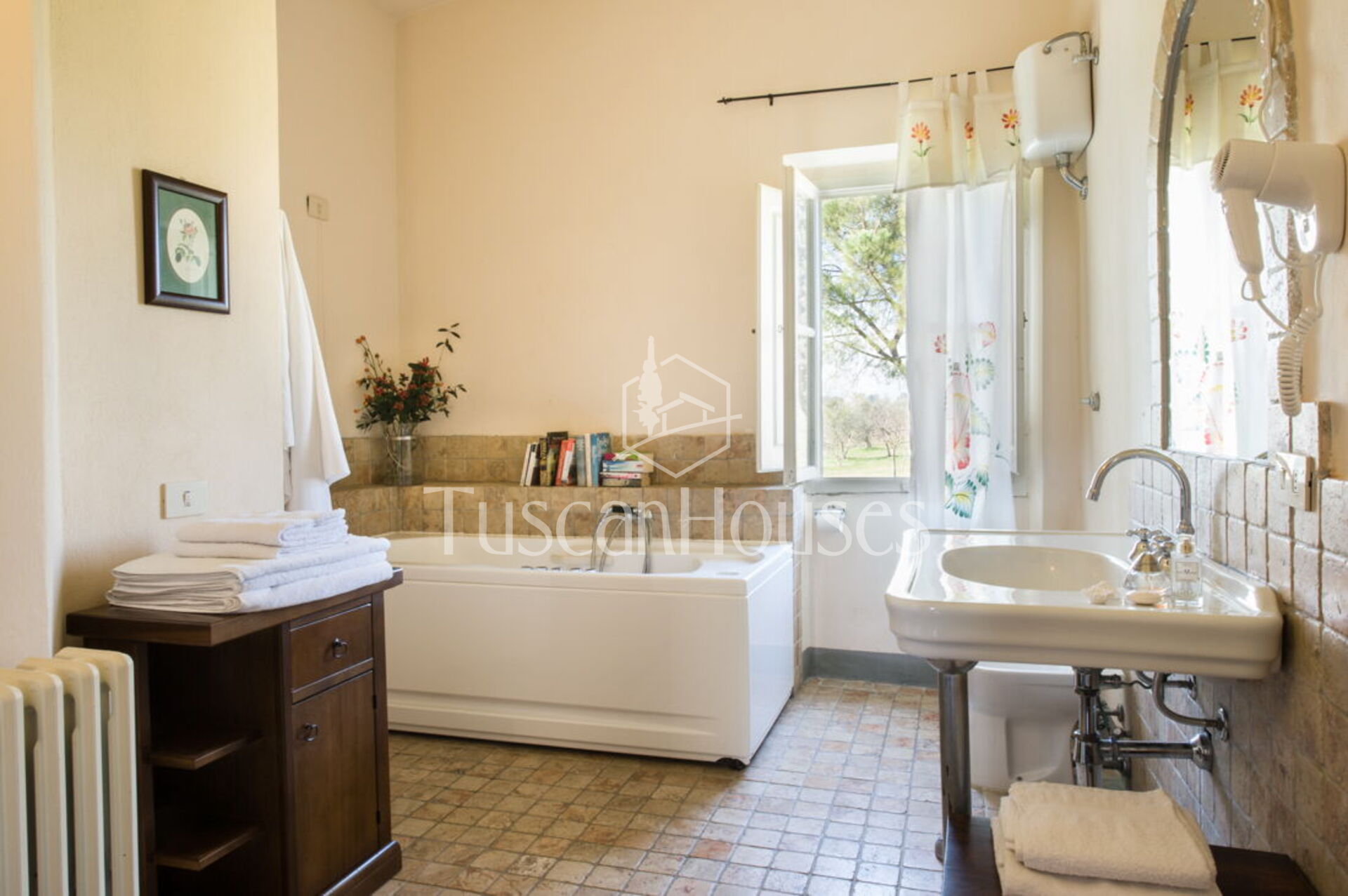 The villa is located on a hill surrounded by olive groves and from the entrance you can see the Val di Chiana valley. The area is made famous thanks to the cultivation of olive trees, and the production of extra virgin olive oil. Its super strategic position allows you to visit the small and famous villages of Tuscany, such as Montepulciano, Siena, Arezzo, Monte San Savino, and many other small towns that during the summer are filled with life with medieval historical demonstrations.