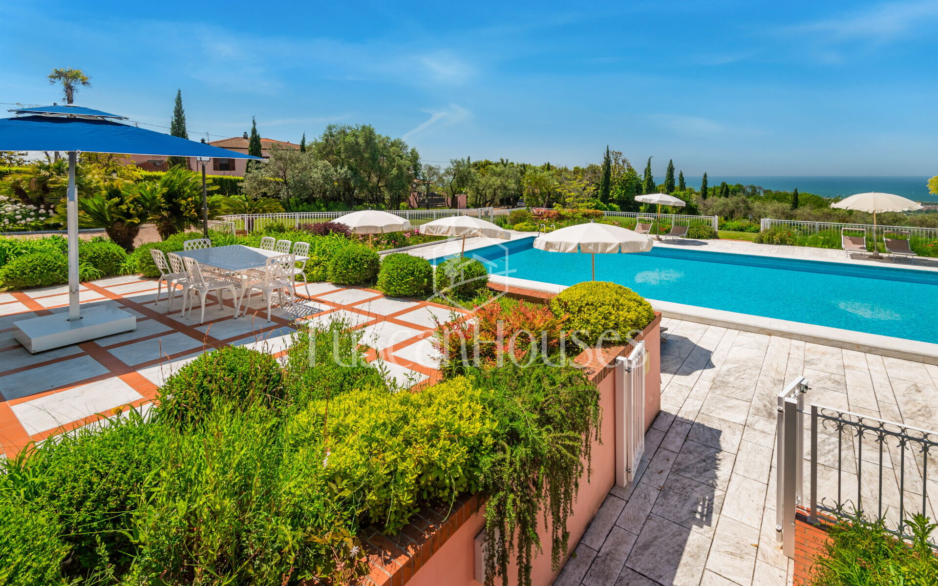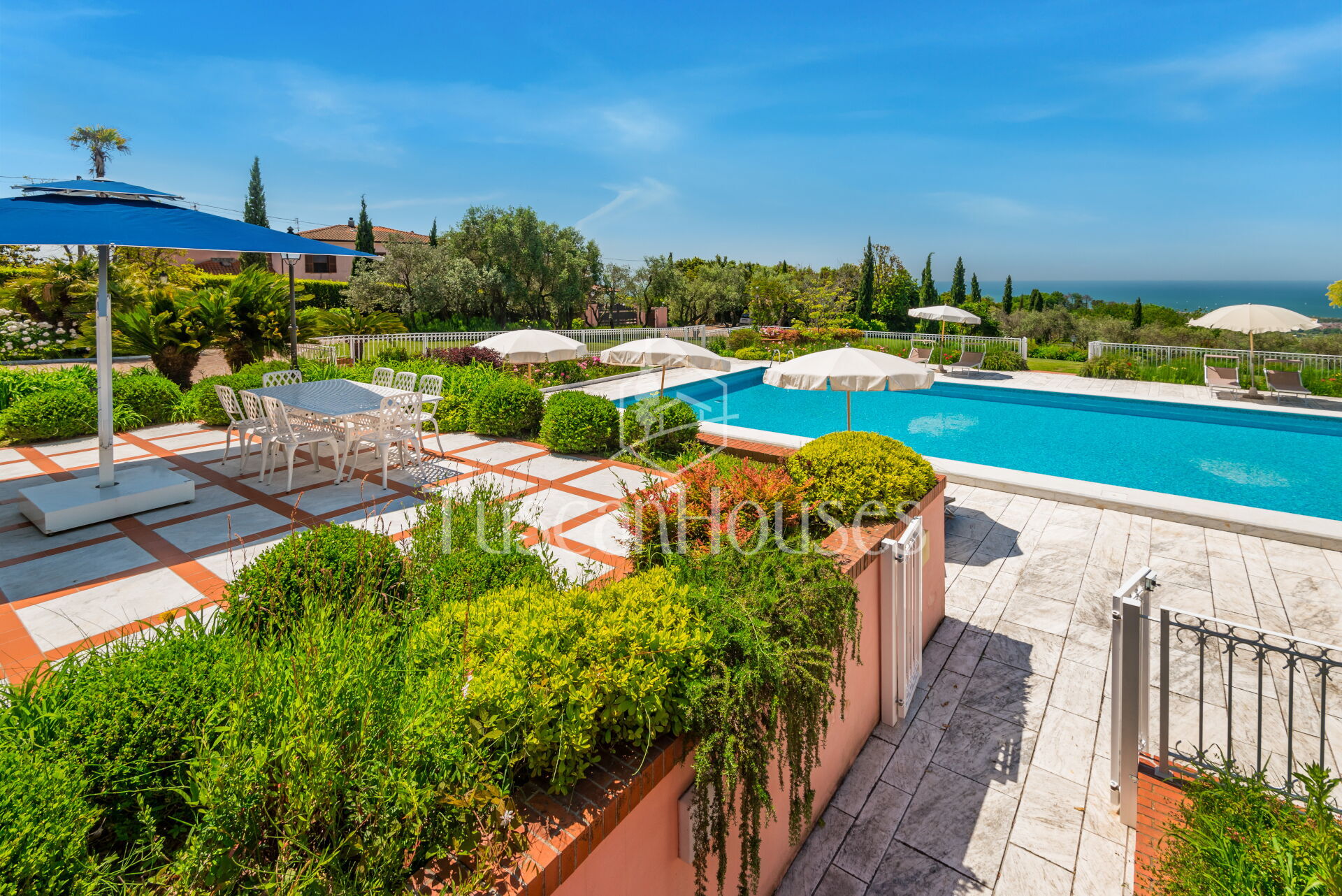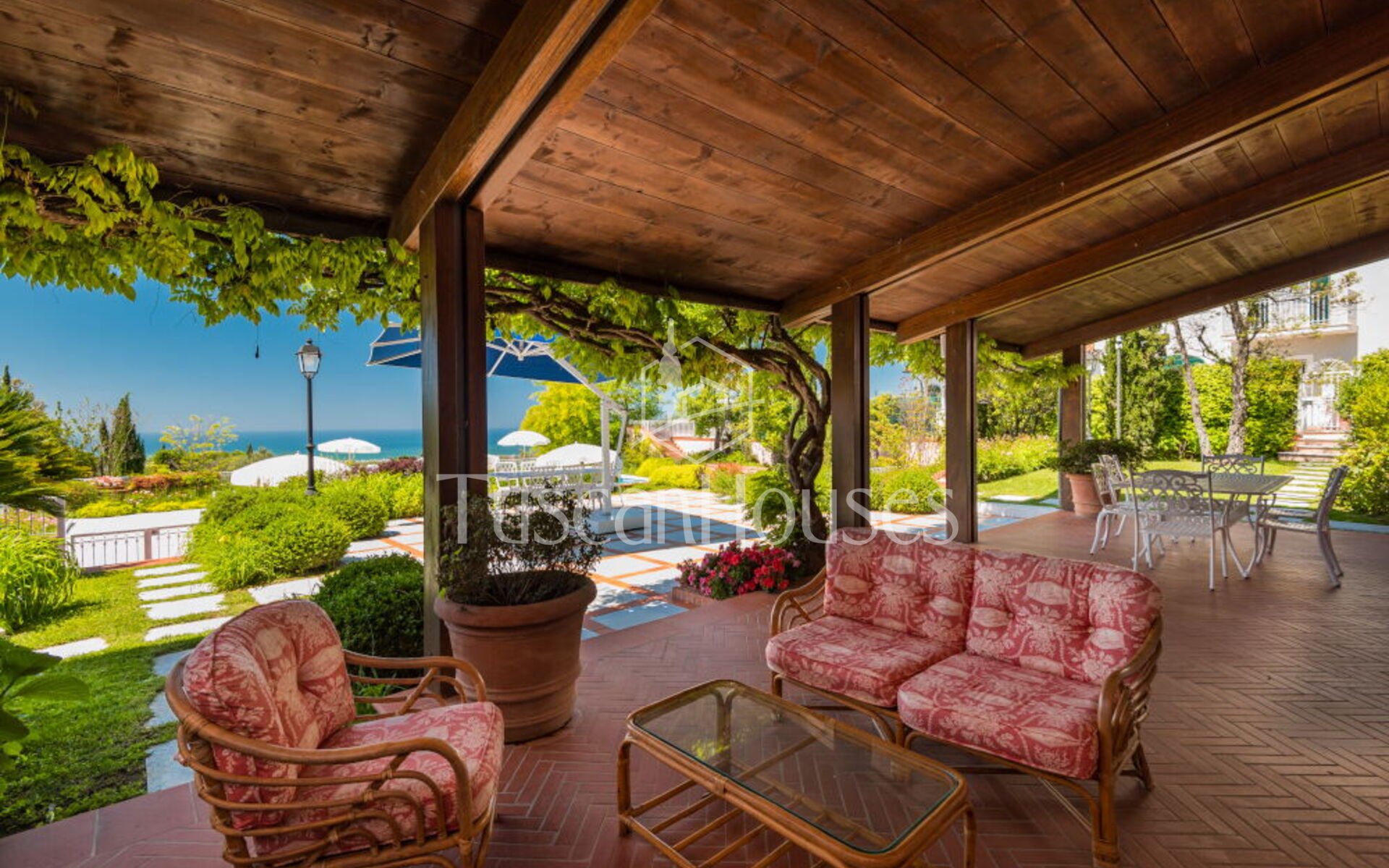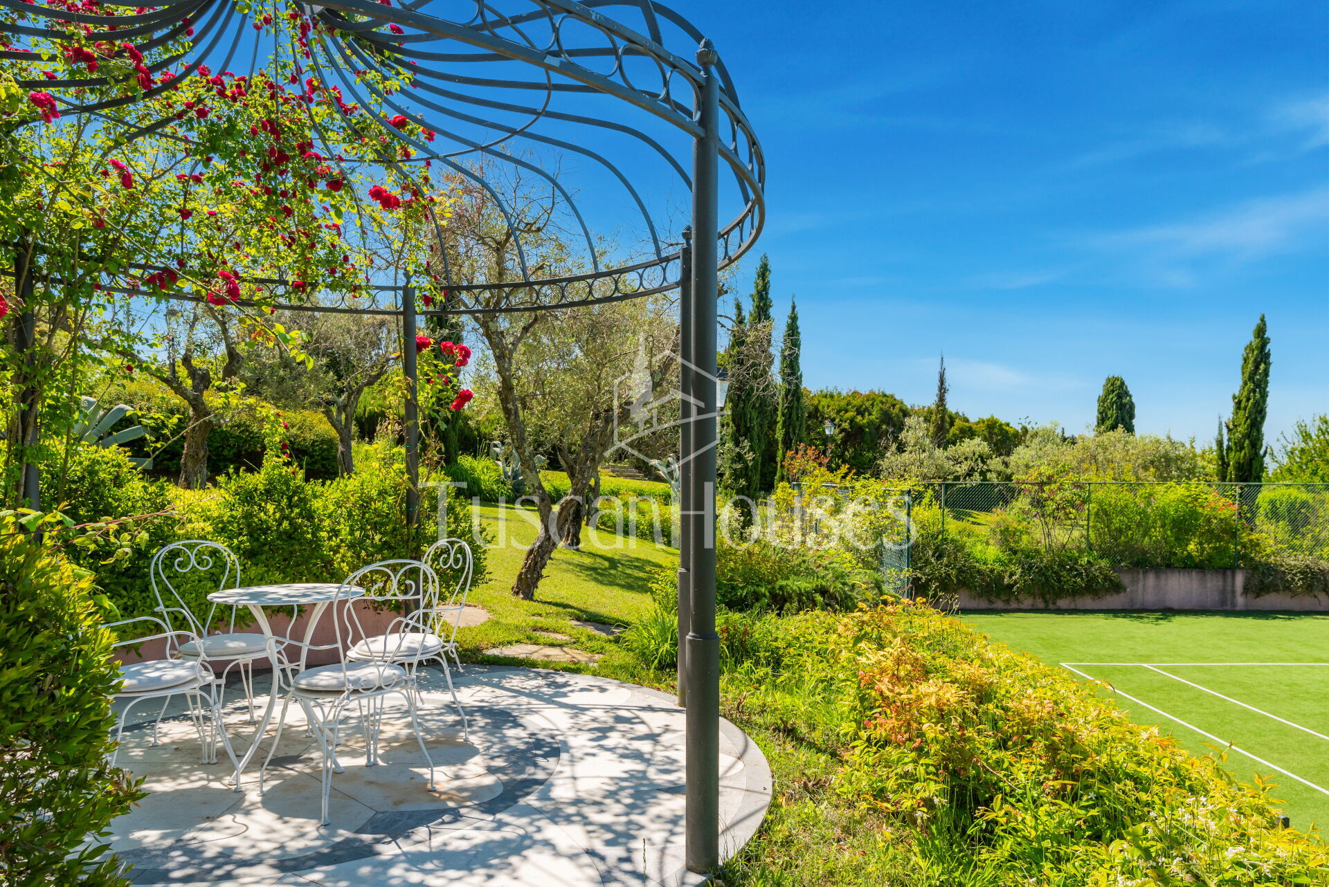 In the vast, completely fenced garden, spanning approximately 3000 square meters, the beauty of nature harmoniously merges with the elegance of the property. The veranda, adjacent to the main house, presents itself as a charming spot for outdoor lunches and dinners under the stars. With a panoramic view of the flower-filled garden, the swimming pool, and the distant sea, this space becomes the pulsating heart of outdoor social life. At the center of this idyllic setting stands the pool, completely fenced for the safety of the little ones, and just a few steps from the pool, there is a private tennis court. The impeccably maintained court offers the opportunity to challenge friends or family to thrilling matches, while enjoying the cool breeze and the joy of outdoor movement, all while taking in the splendid sea view. Additionally, a spacious private lawn, enveloped by the lush greenery of the garden, offers an open space for games, picnics, or simply lounging and gazing at the sky. In this private paradise, every corner reflects attention to detail and a love for beauty, offering guests an unforgettable experience of relaxation.