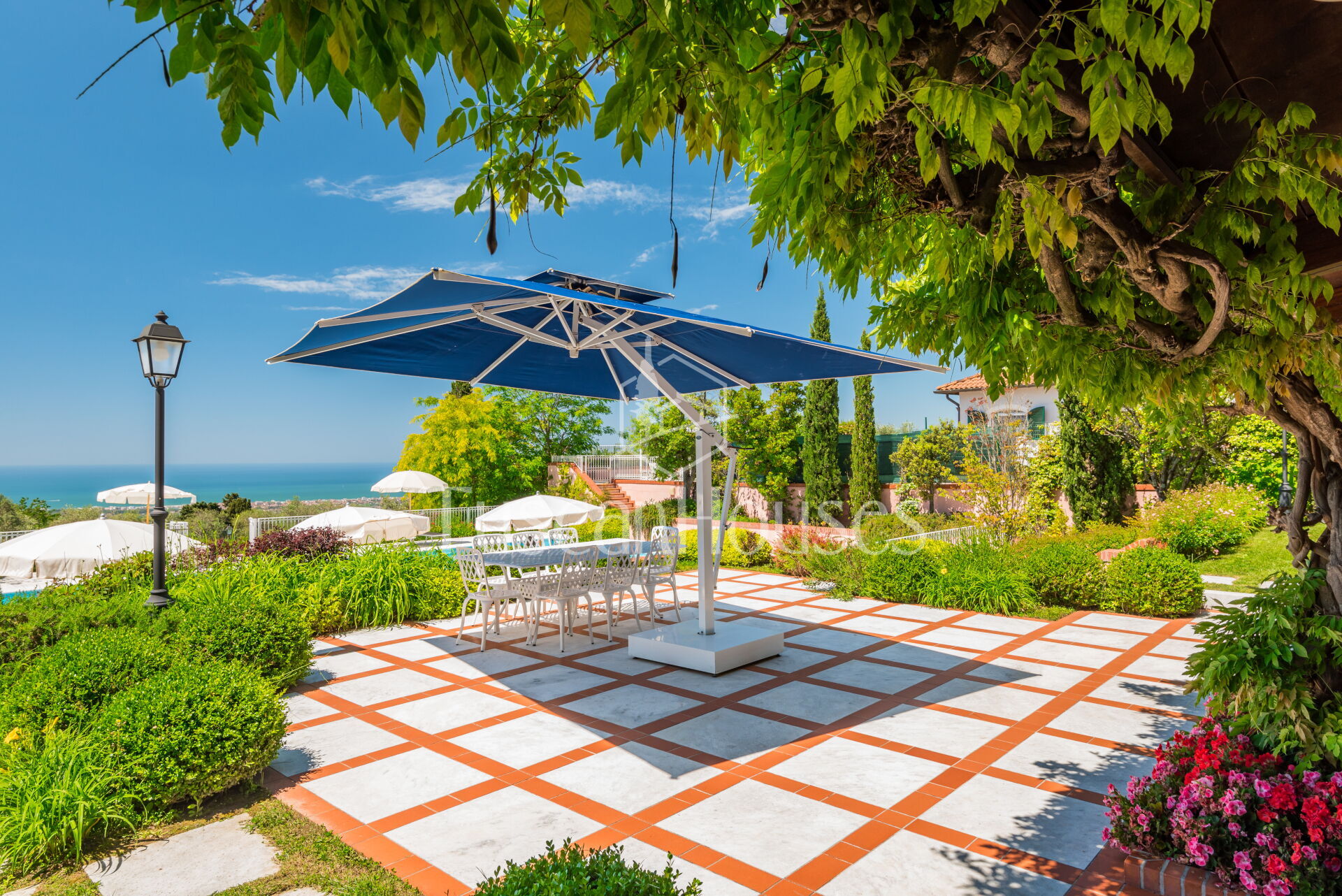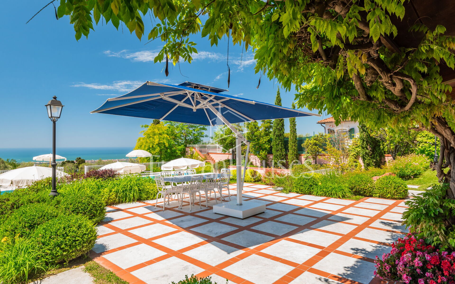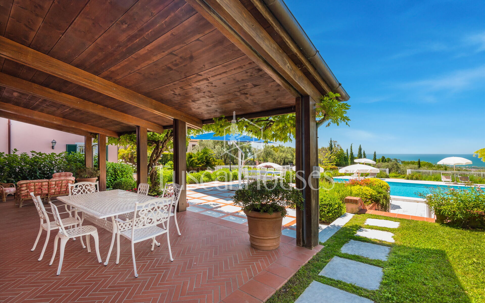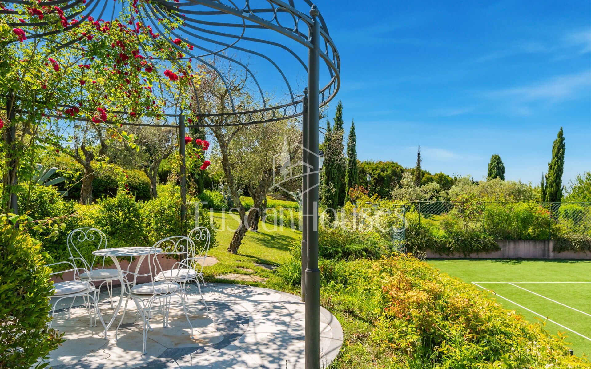 In the vast, completely fenced garden, spanning approximately 3000 square meters, the beauty of nature harmoniously merges with the elegance of the property. The veranda, adjacent to the main house, presents itself as a charming spot for outdoor lunches and dinners under the stars. With a panoramic view of the flower-filled garden, the swimming pool, and the distant sea, this space becomes the pulsating heart of outdoor social life. At the center of this idyllic setting stands the pool, completely fenced for the safety of the little ones, and just a few steps from the pool, there is a private tennis court. The impeccably maintained court offers the opportunity to challenge friends or family to thrilling matches, while enjoying the cool breeze and the joy of outdoor movement, all while taking in the splendid sea view. Additionally, a spacious private lawn, enveloped by the lush greenery of the garden, offers an open space for games, picnics, or simply lounging and gazing at the sky. In this private paradise, every corner reflects attention to detail and a love for beauty, offering guests an unforgettable experience of relaxation.