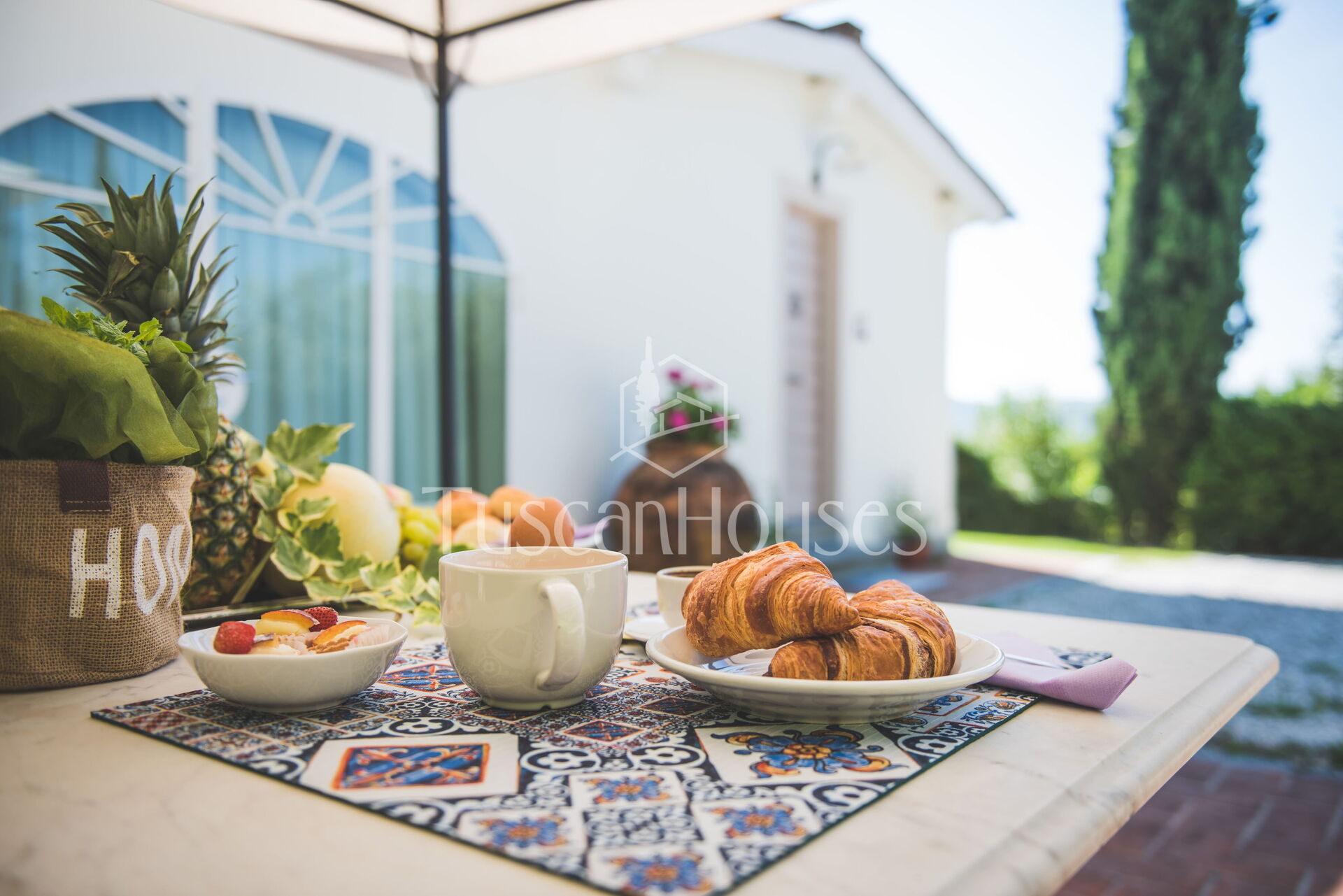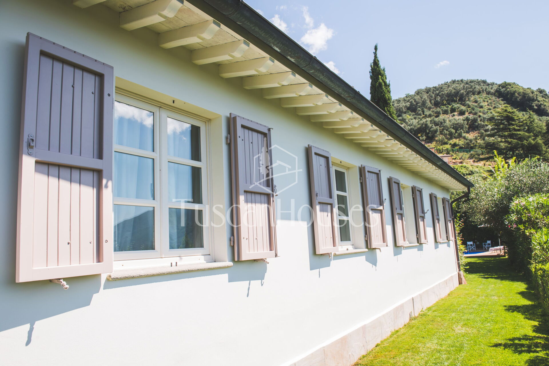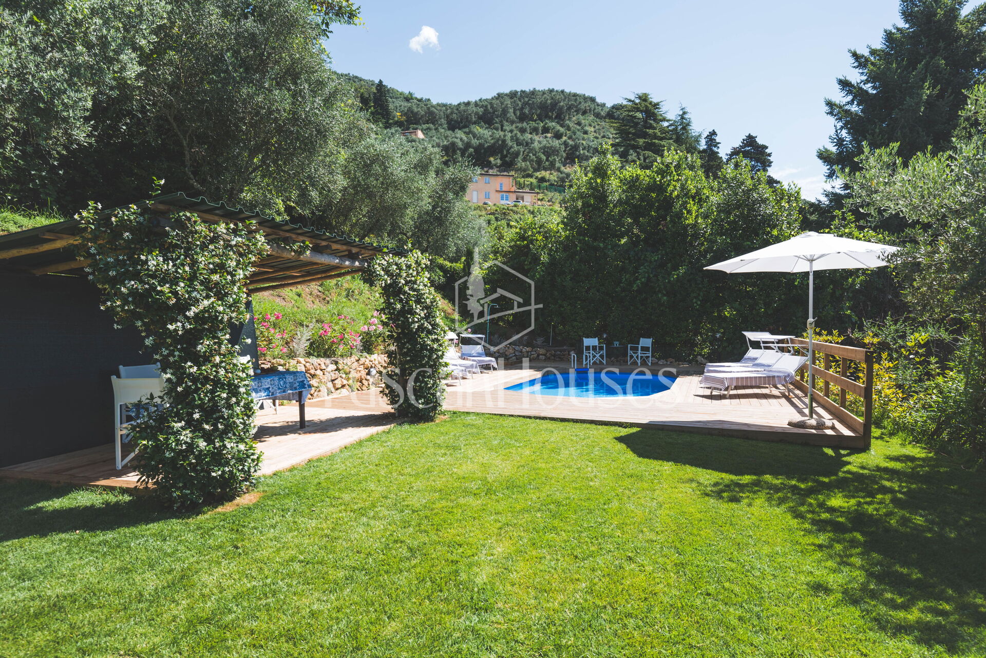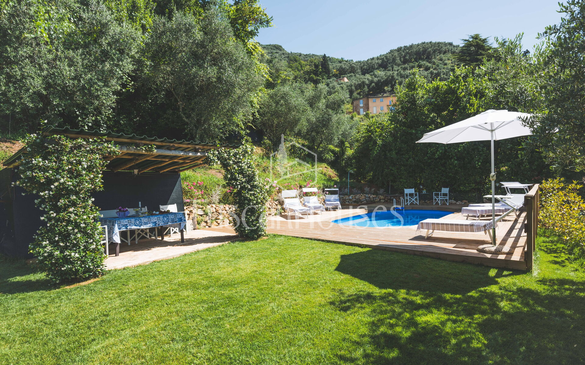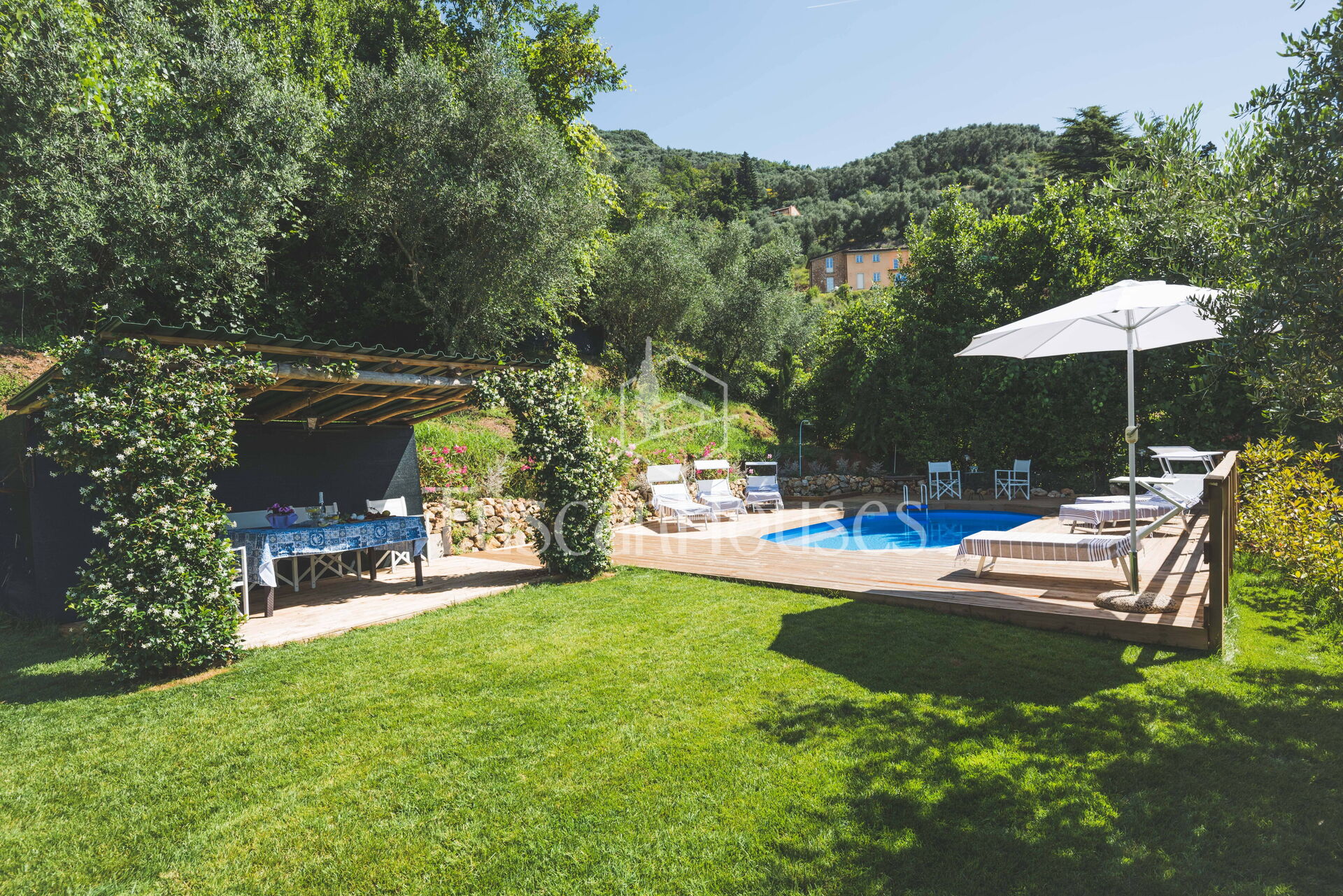 Outside, Casa La Collina offers a green oasis of relaxation, just a stone's throw away from Camaiore. The outdoor pergola is the perfect spot to relish al fresco lunches and dinners, while the pool, complete with comfortable loungers and umbrellas, invites pure leisure and sun-soaked repose in the Tuscan breeze.