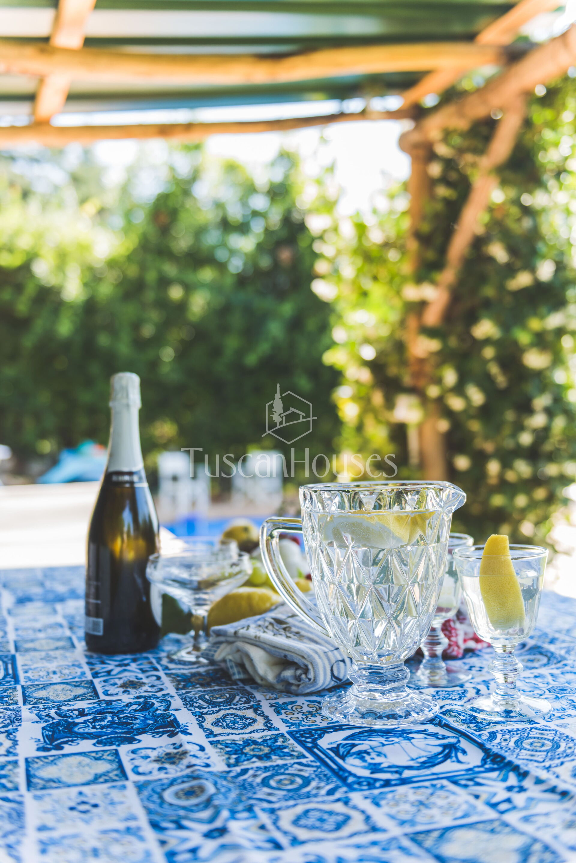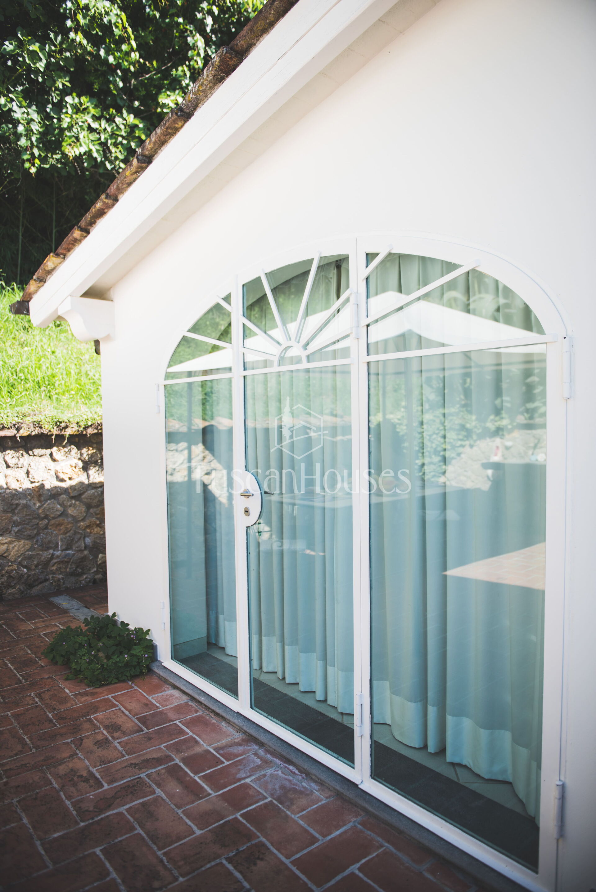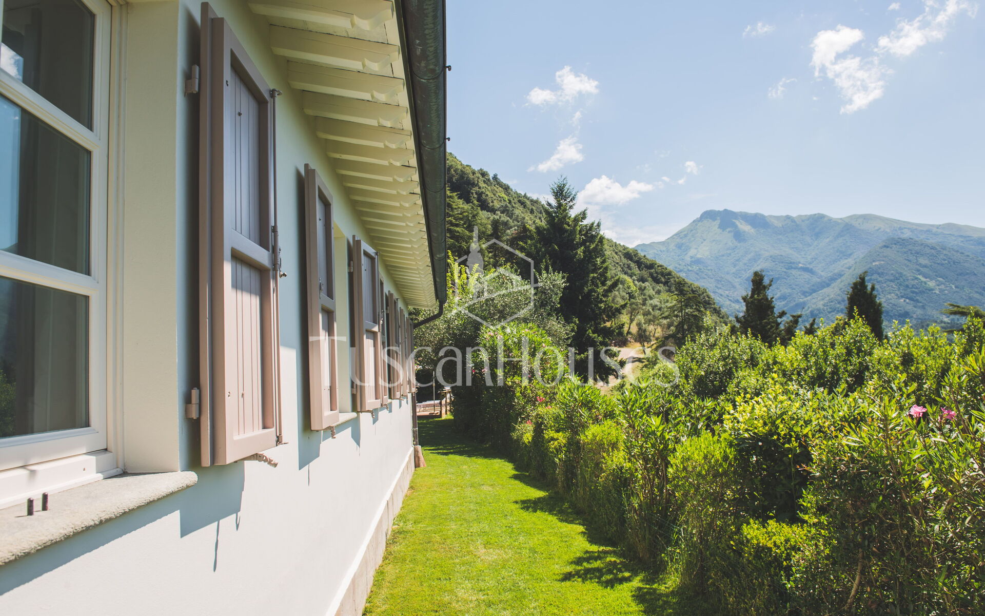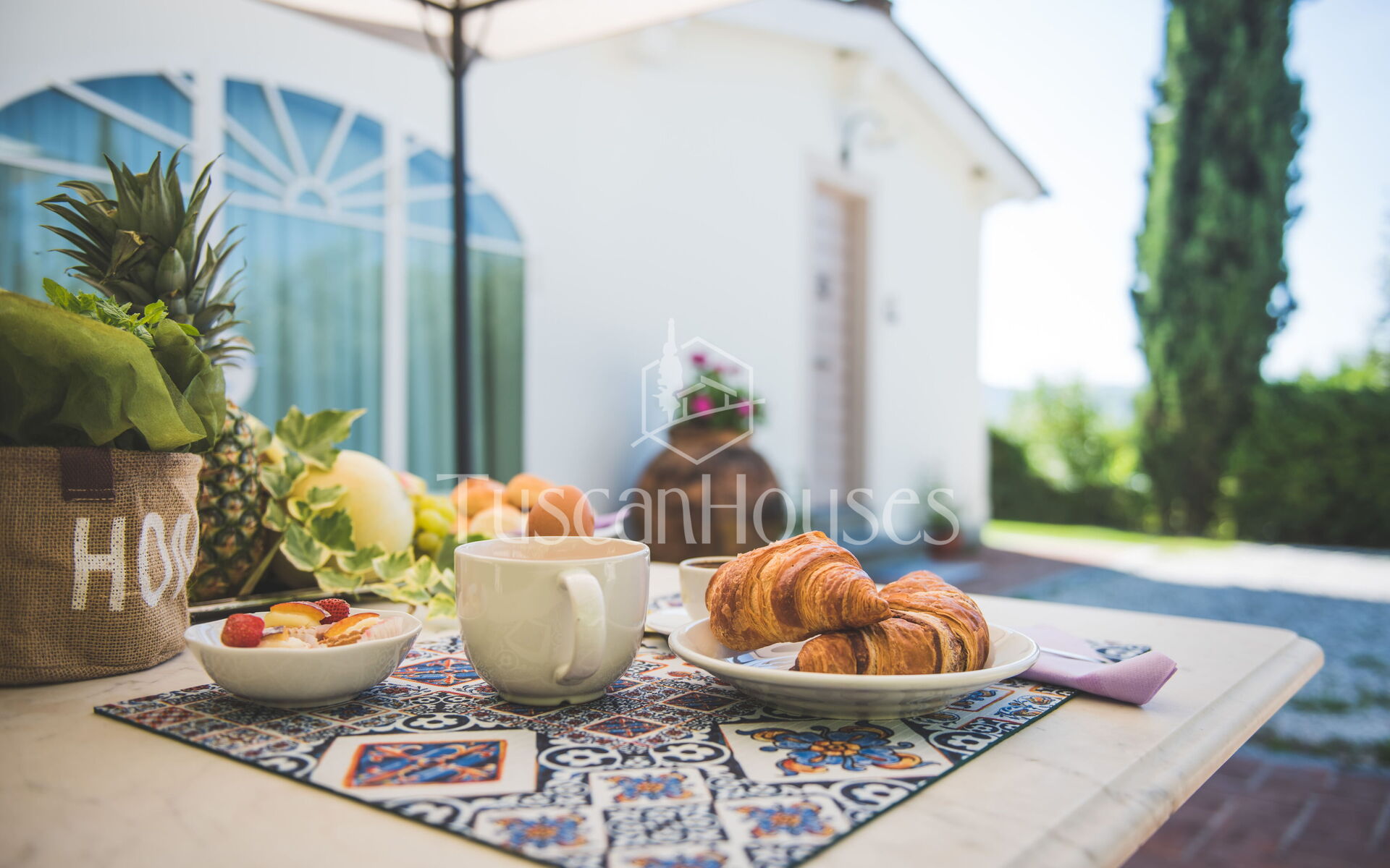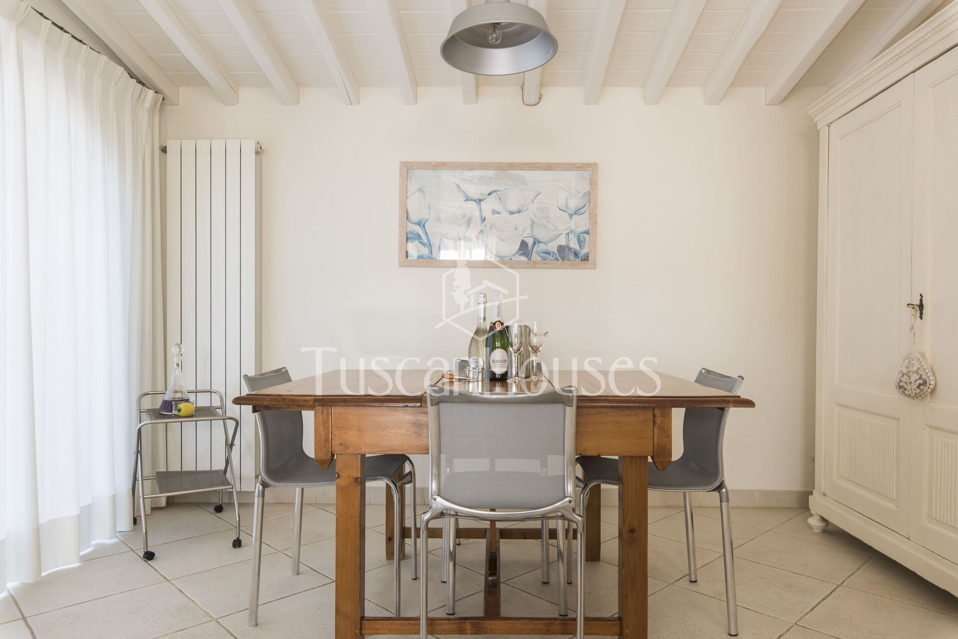 Outside, Casa La Collina offers a green oasis of relaxation, just a stone's throw away from Camaiore. The outdoor pergola is the perfect spot to relish al fresco lunches and dinners, while the pool, complete with comfortable loungers and umbrellas, invites pure leisure and sun-soaked repose in the Tuscan breeze.