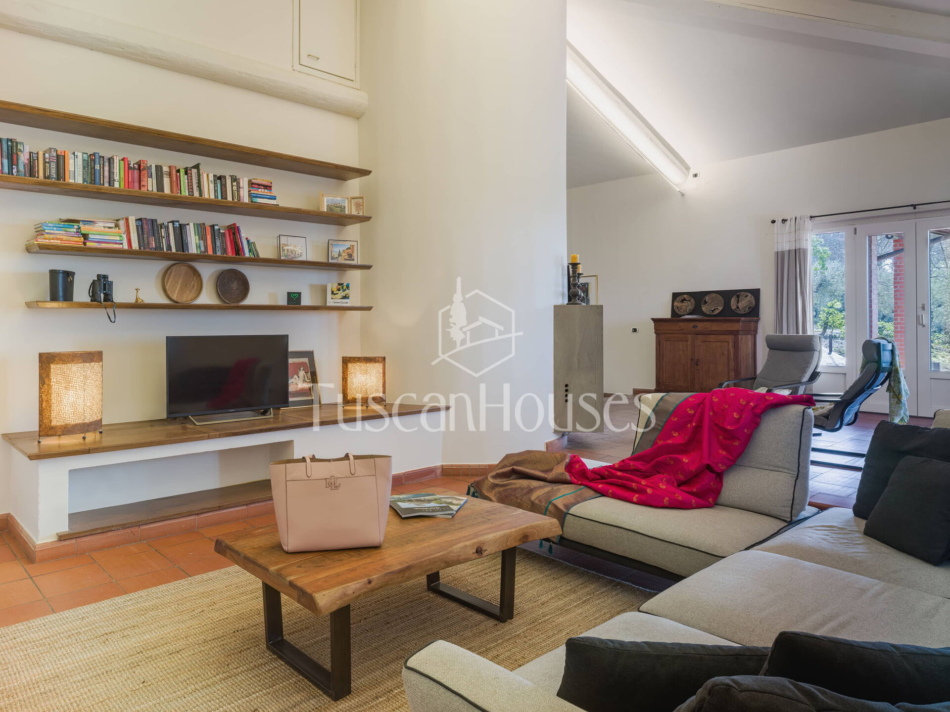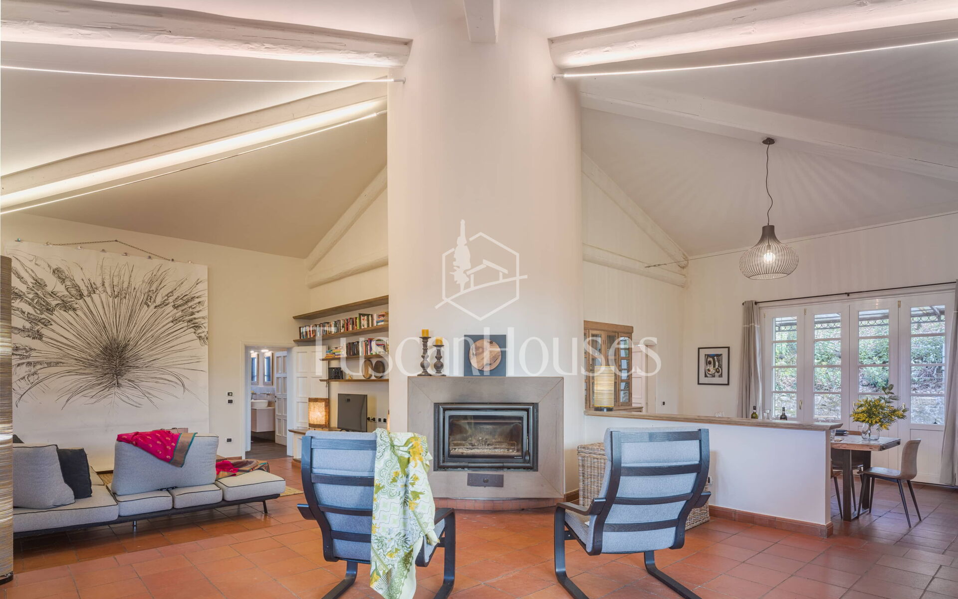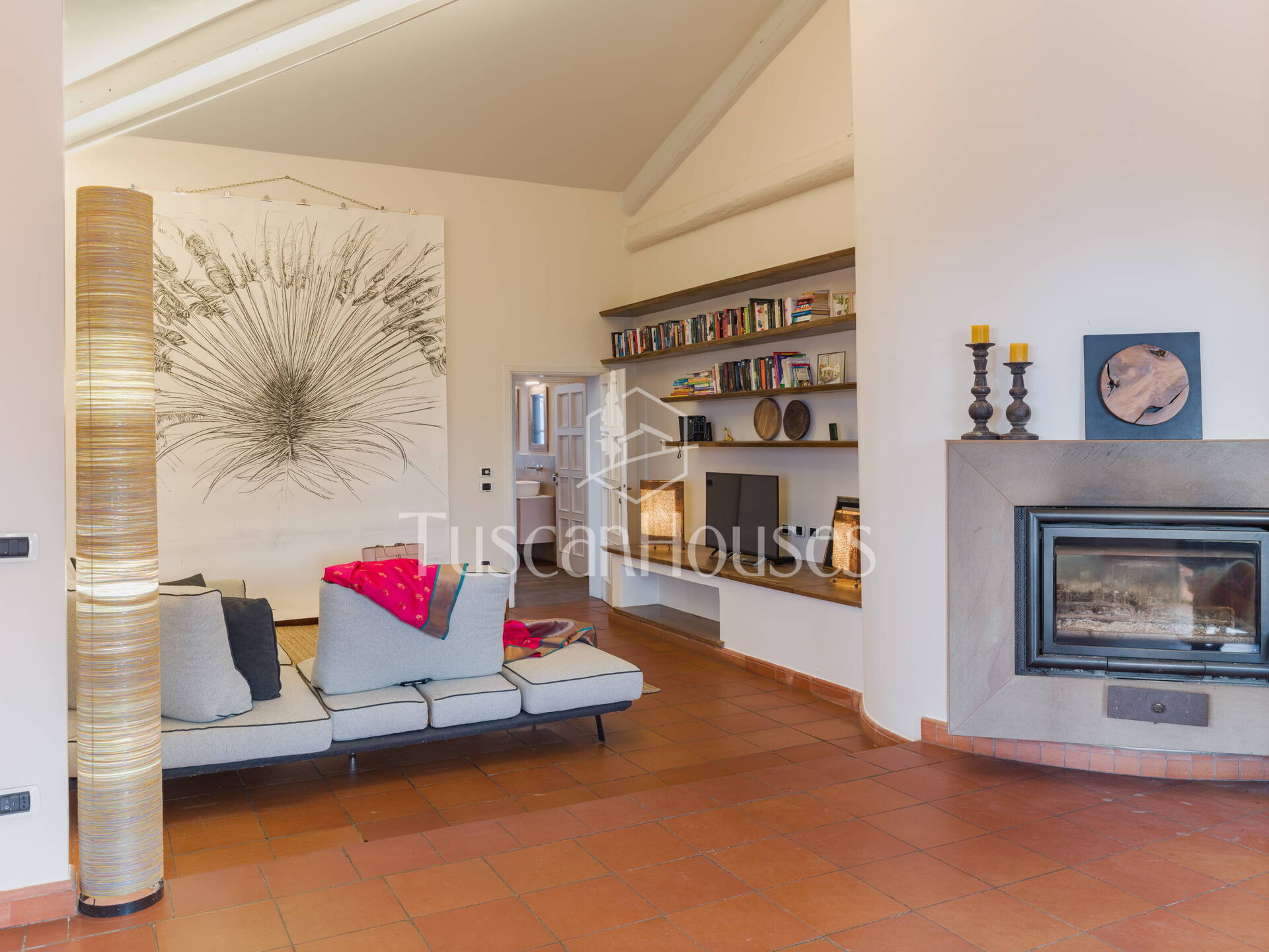 The main entrance opens into a spacious and comfortable living area with sofas, armchairs and TV, creating a welcoming space for relaxation.