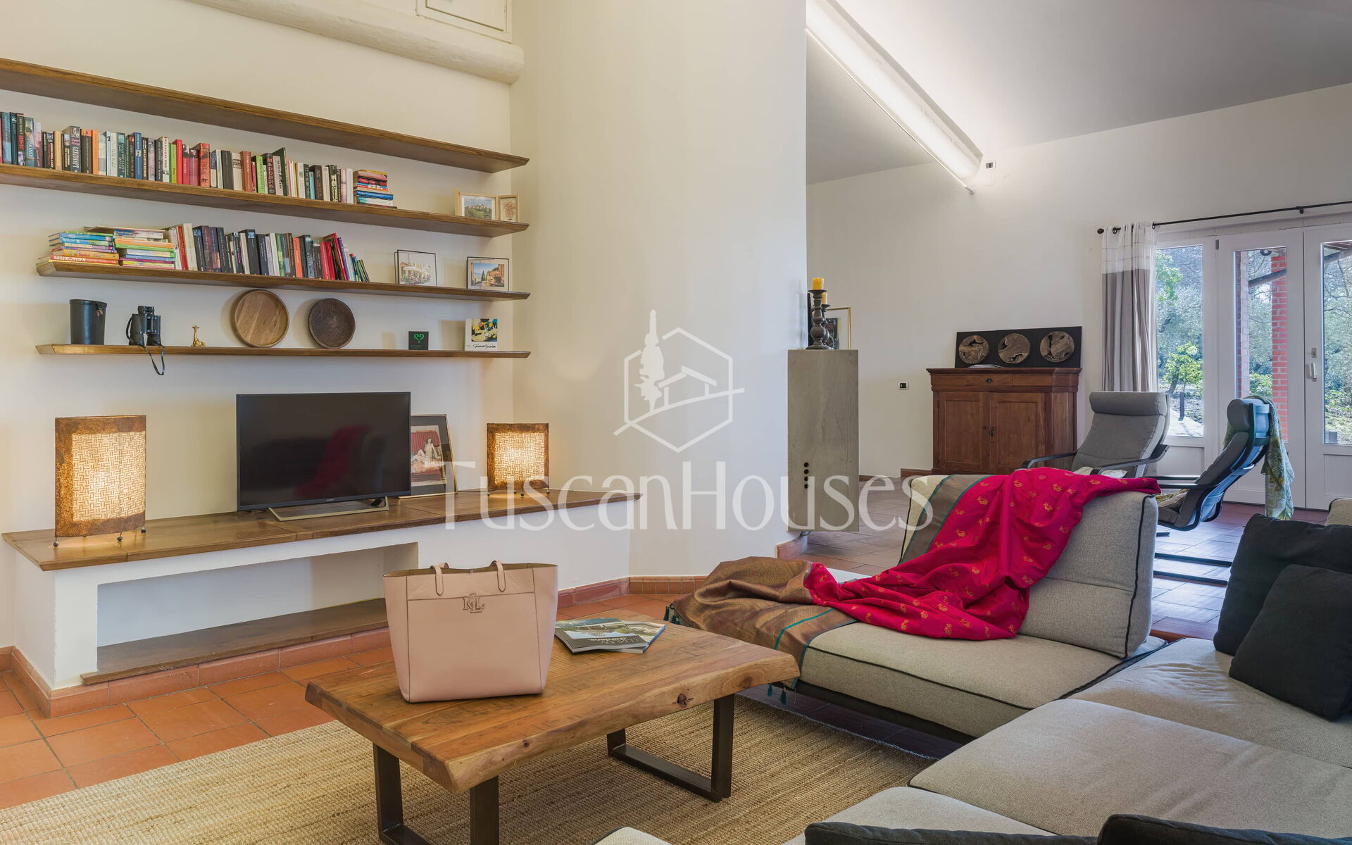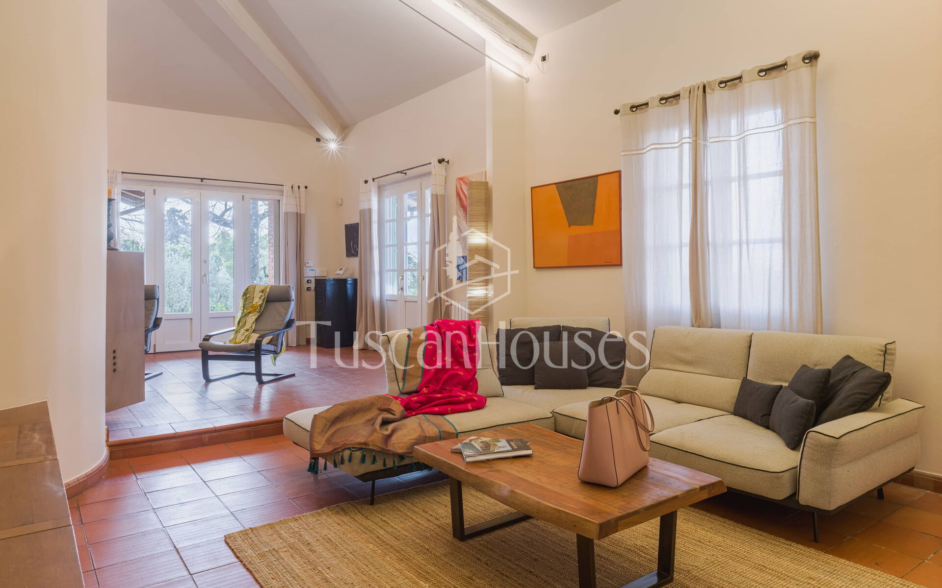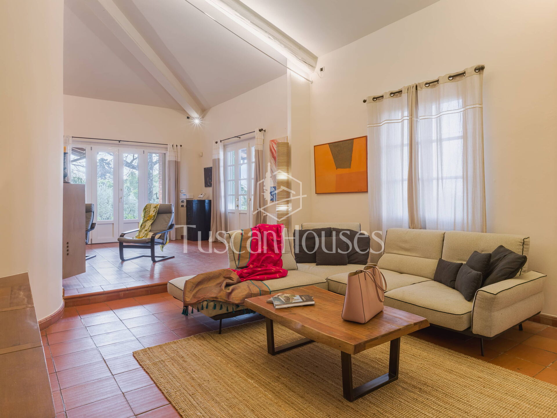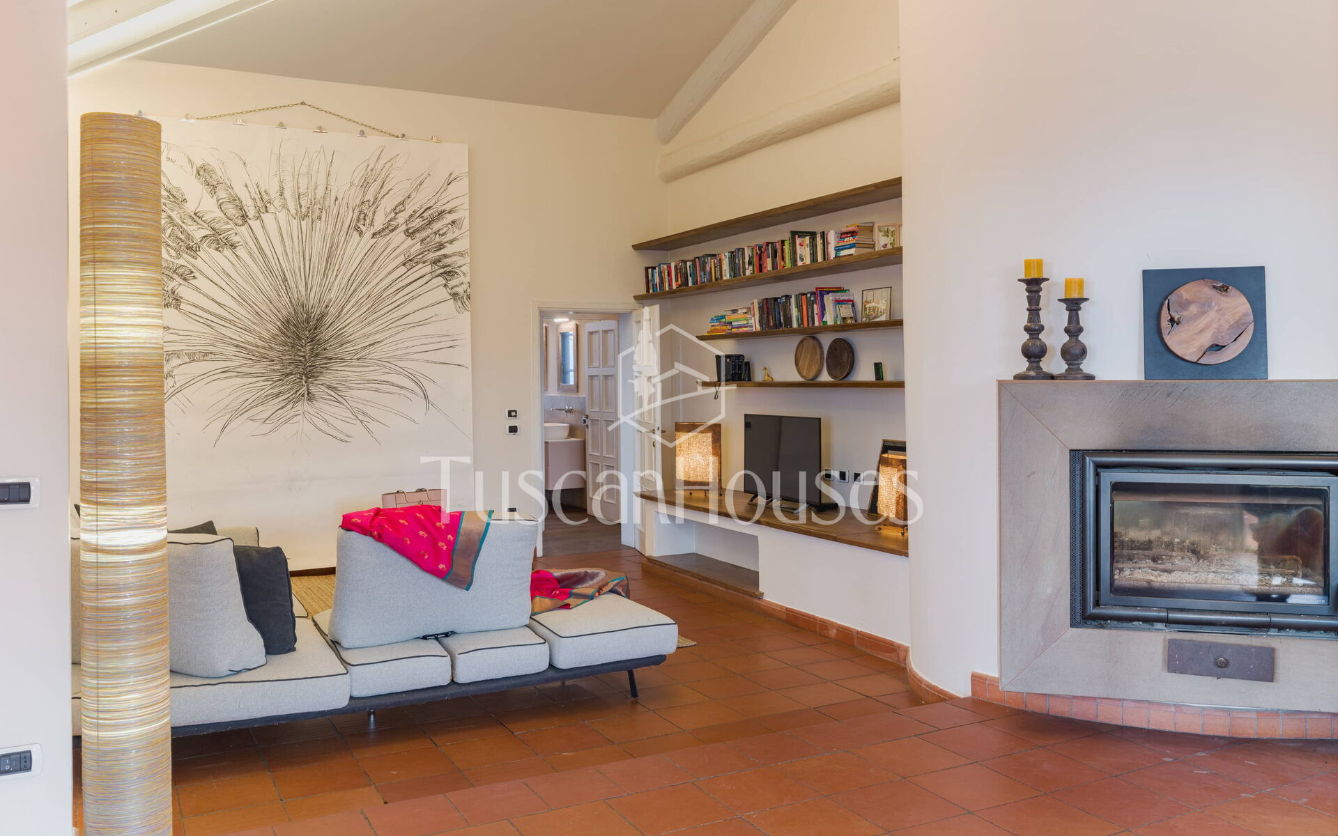The main entrance opens into a spacious and comfortable living area with sofas, armchairs and TV, creating a welcoming space for relaxation.