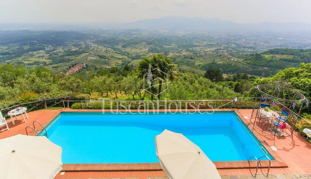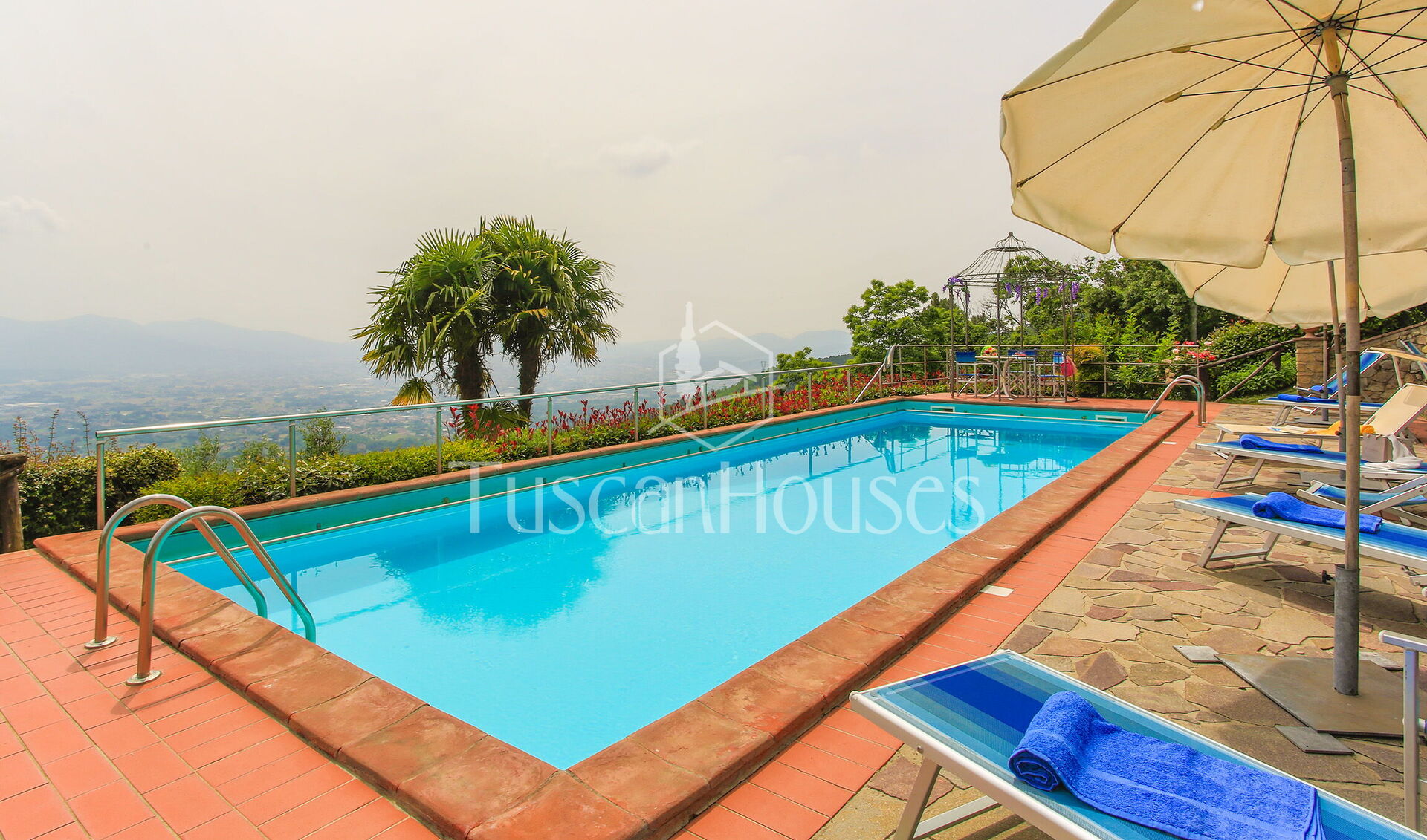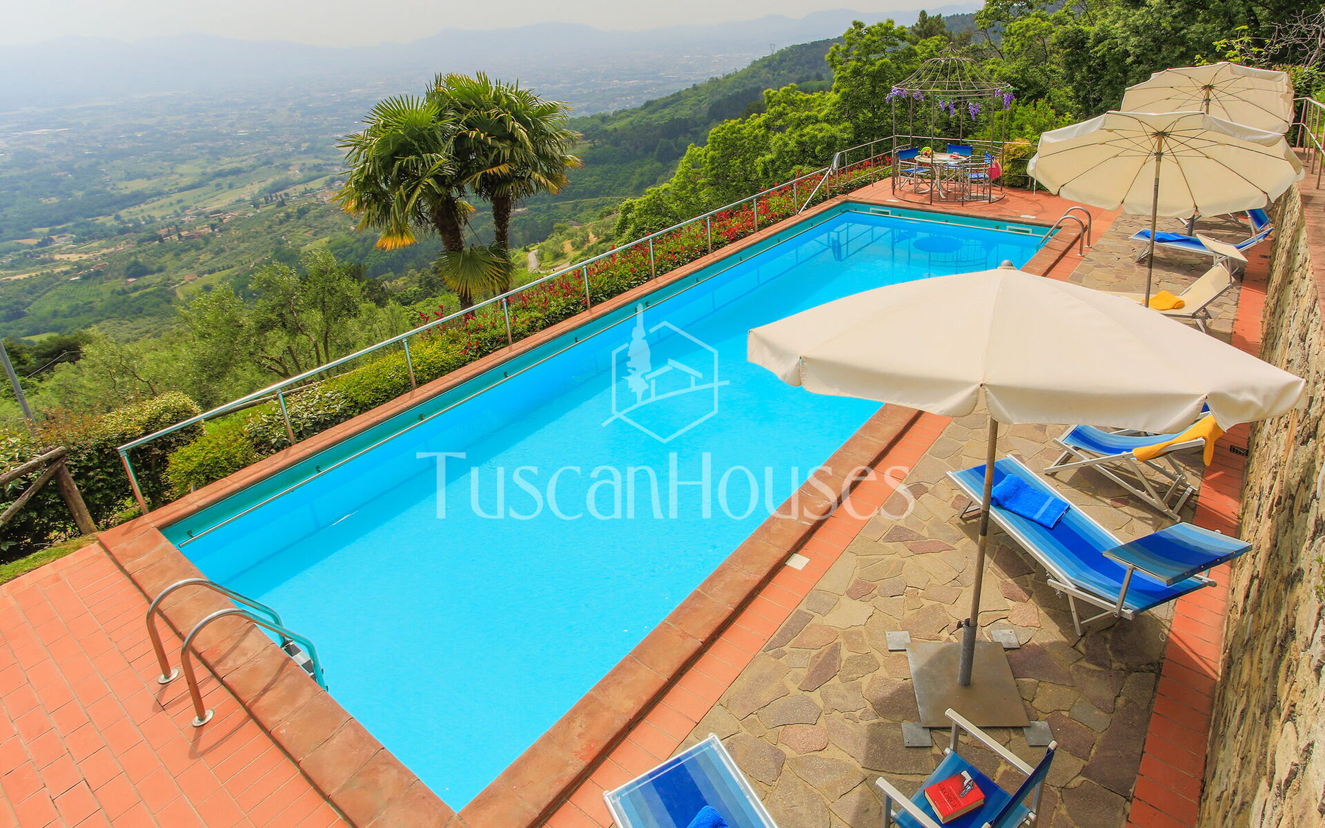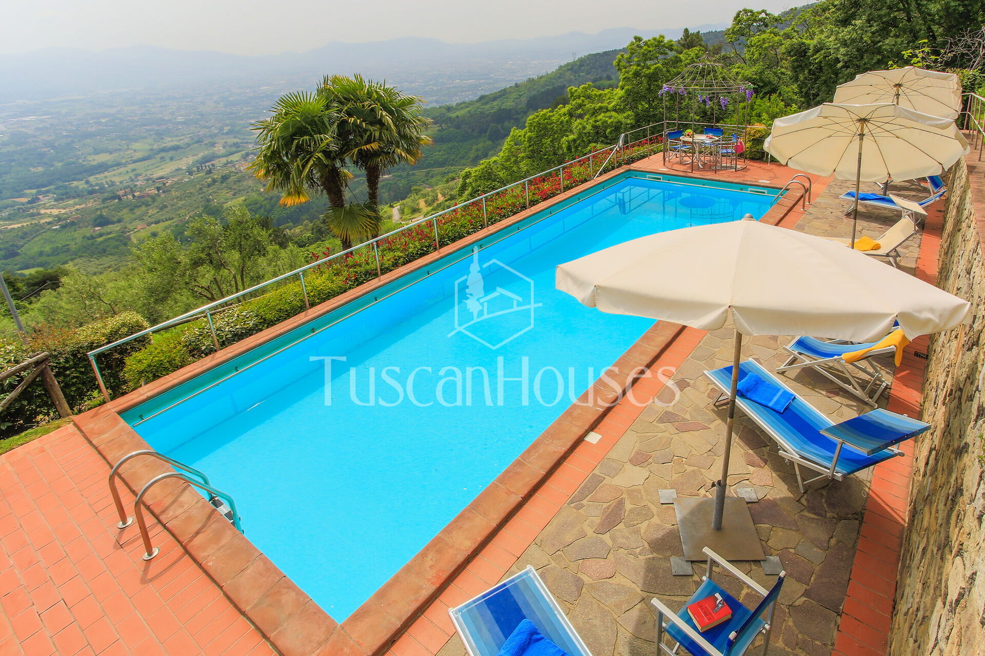 Stone farmhouse with panoramic pool on the Lucca hills, views over Valdinievole, authentic Tuscan style, ideal for groups and relaxation.