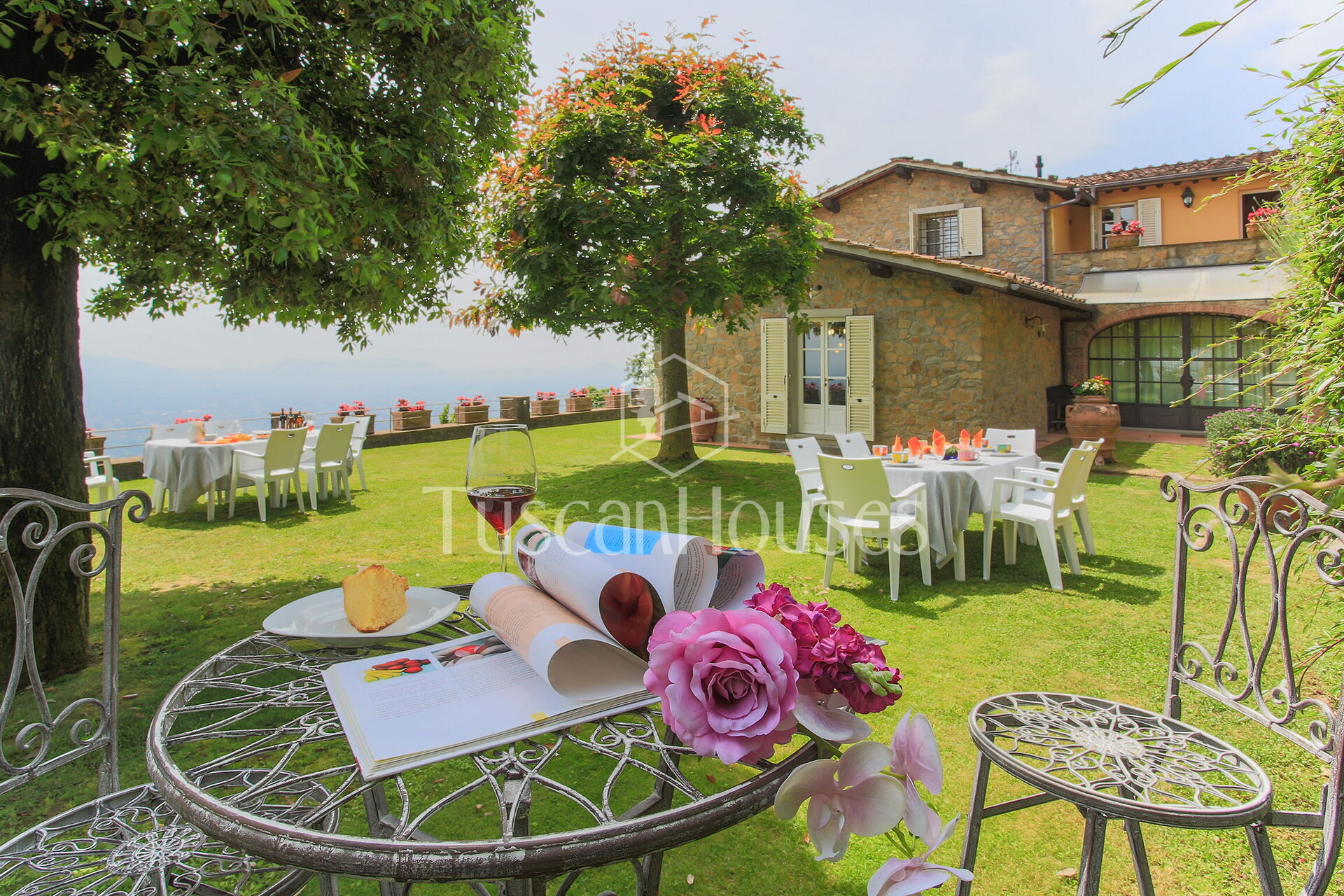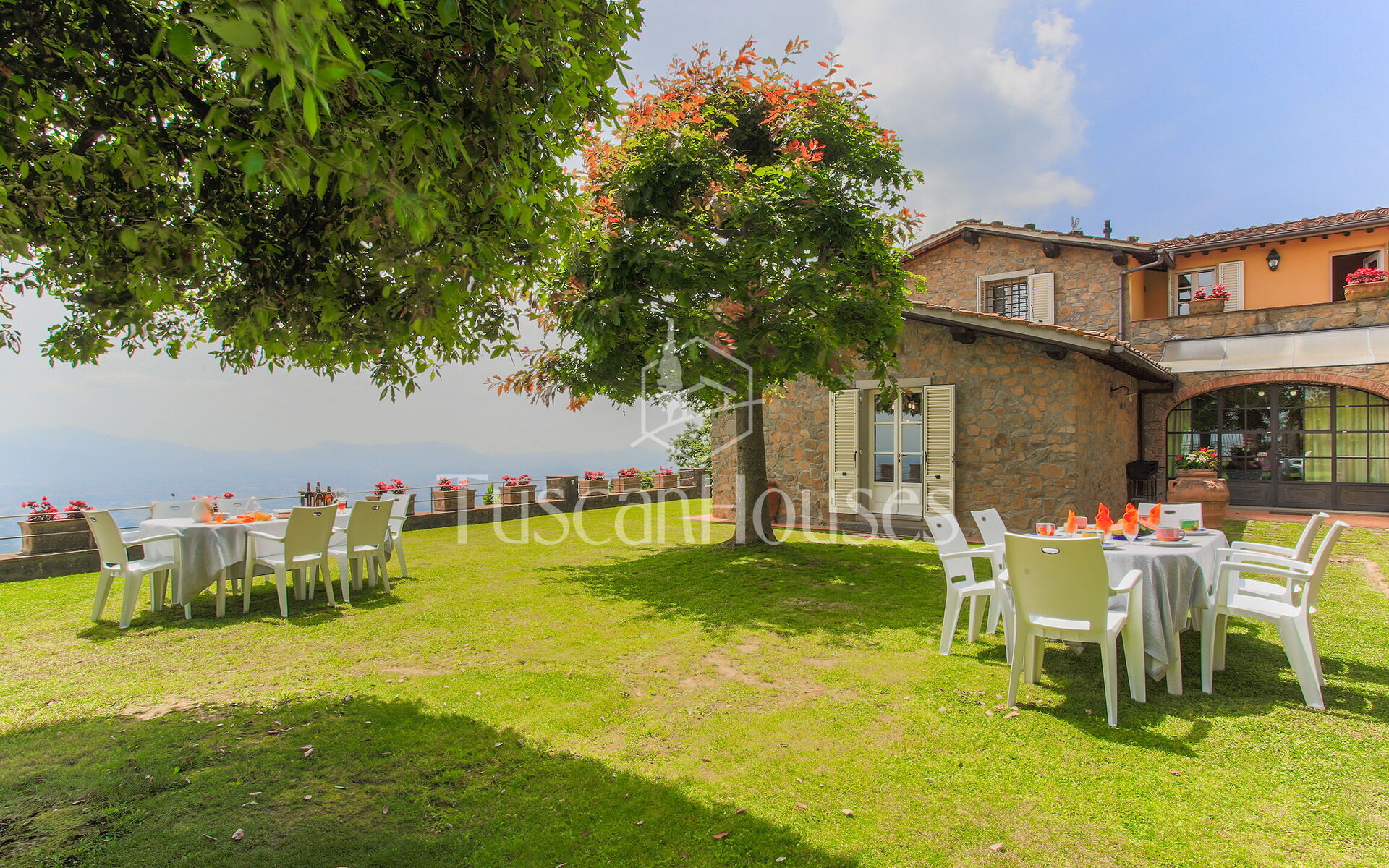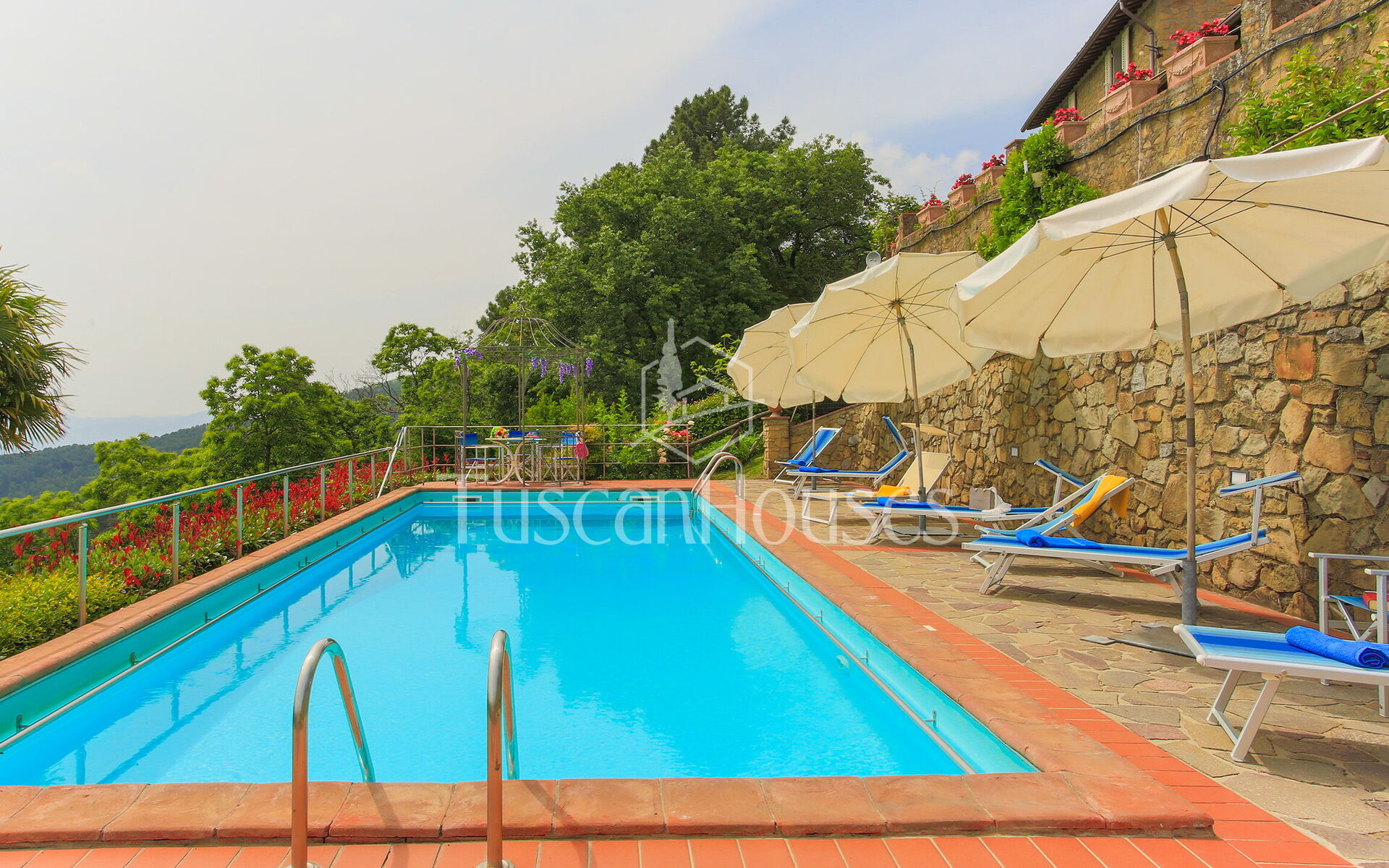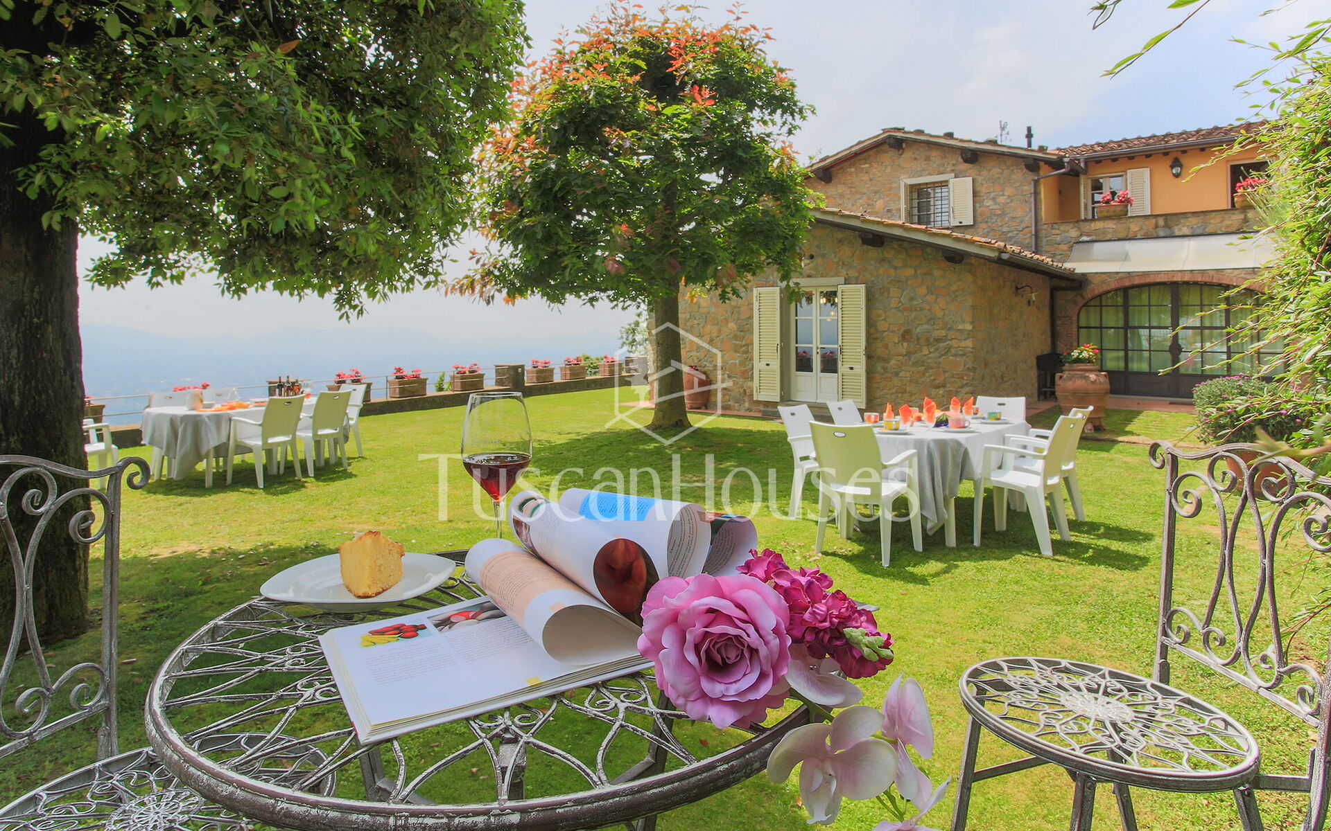 Stone farmhouse with panoramic pool on the Lucca hills, views over Valdinievole, authentic Tuscan style, ideal for groups and relaxation.