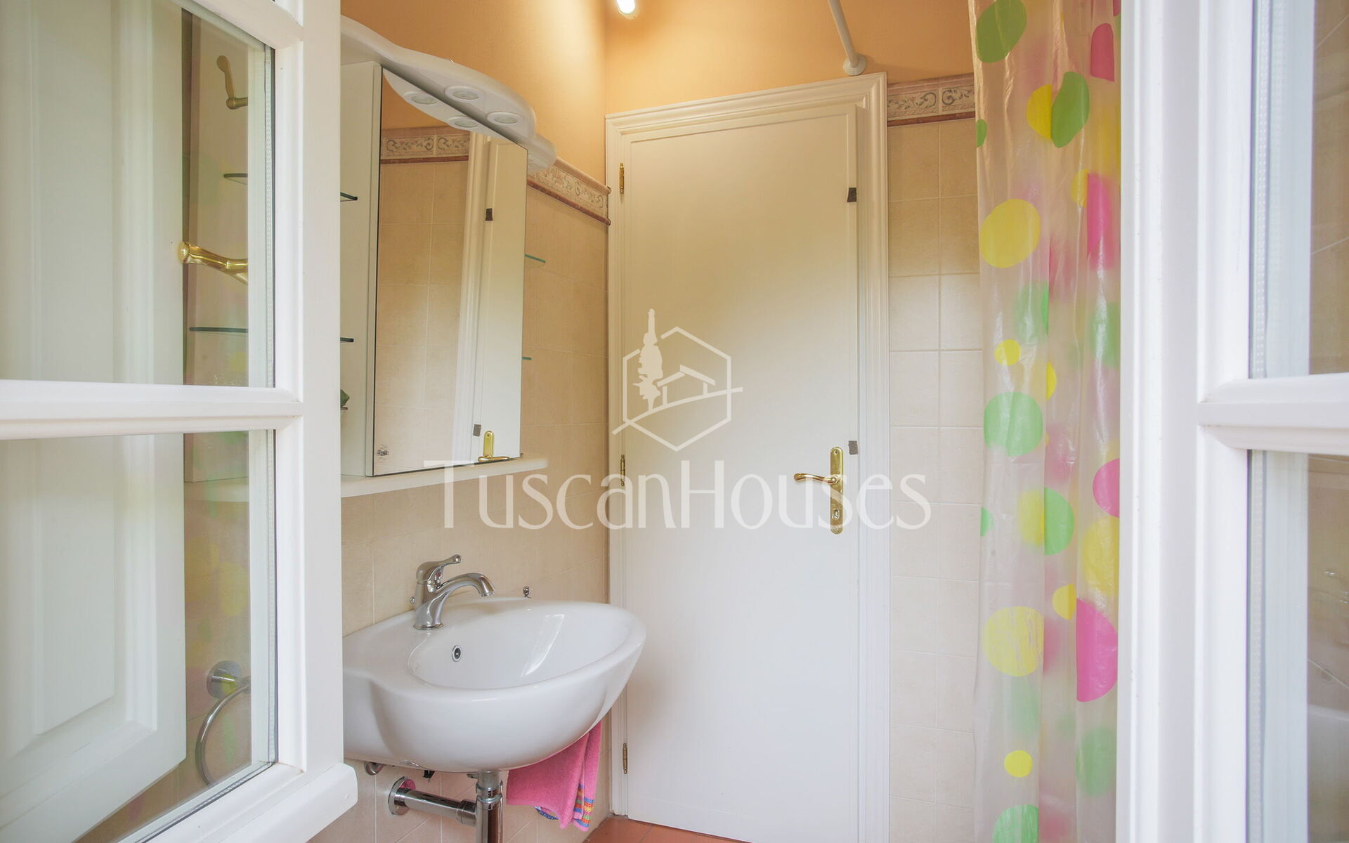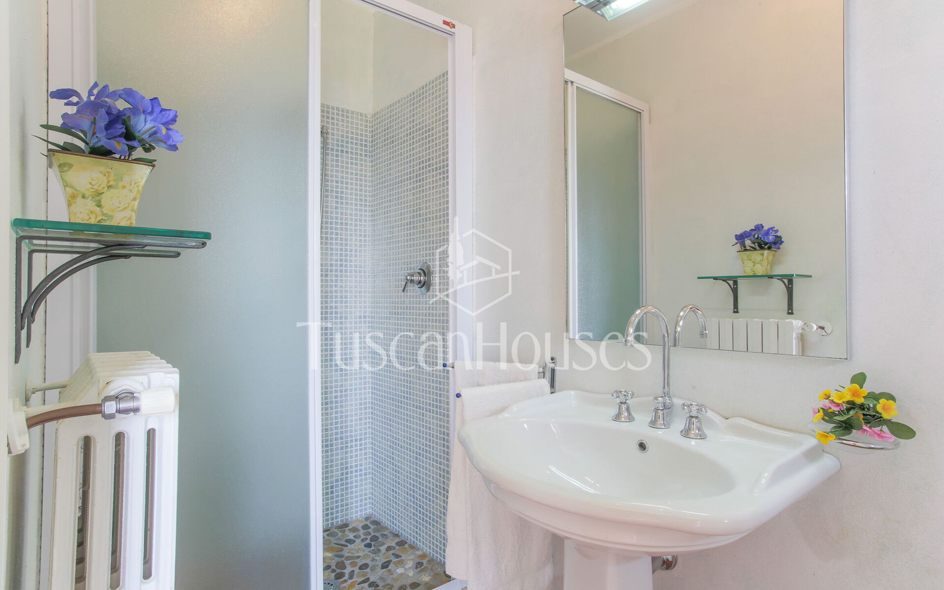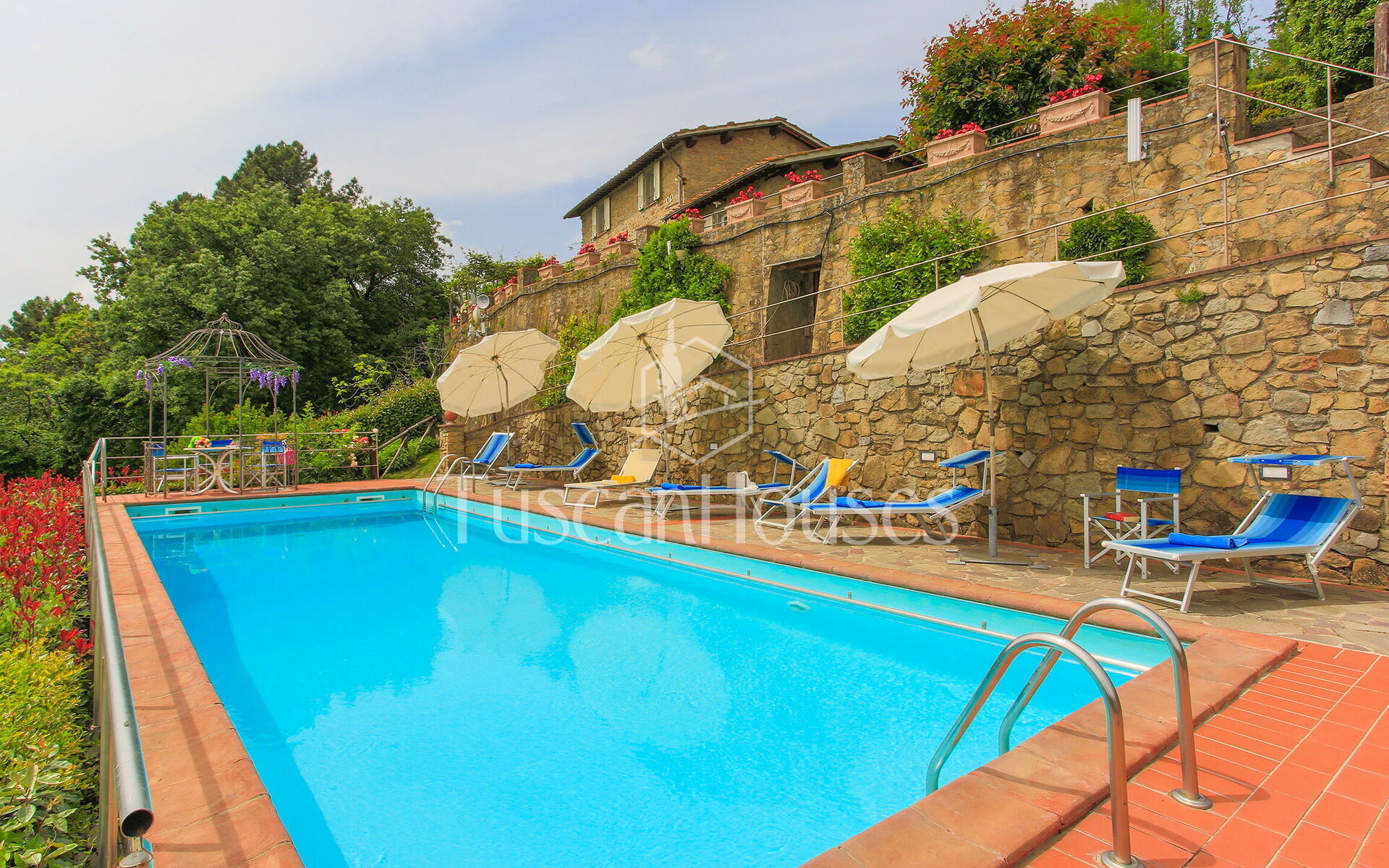 The swimming pool, has a rectangular shape and measures 11 x 4.5 metres with a variable depth from 1.20 to 2.40 metres. It has chlorine depuration and linen by a PVC light blue line. The entrance in the pool is through two internal staircases. The pool distances about 20 metres and accessible through a staircase of about 21 steps. The solarium area is paved and has type of plants and flowers and is equipped with sunbeds, sun lounges and umbrella. There is also a solar shower.