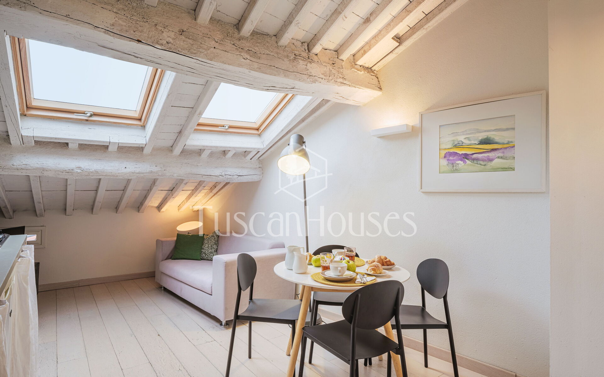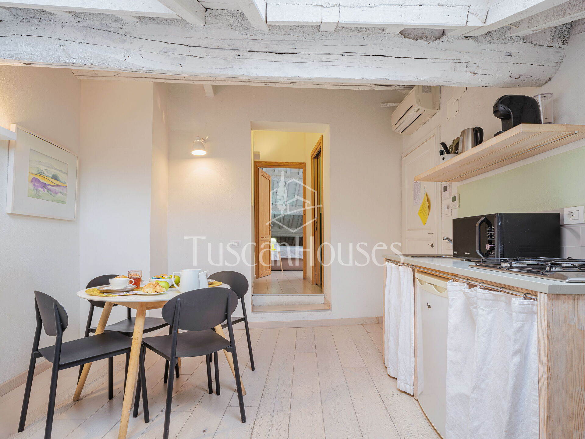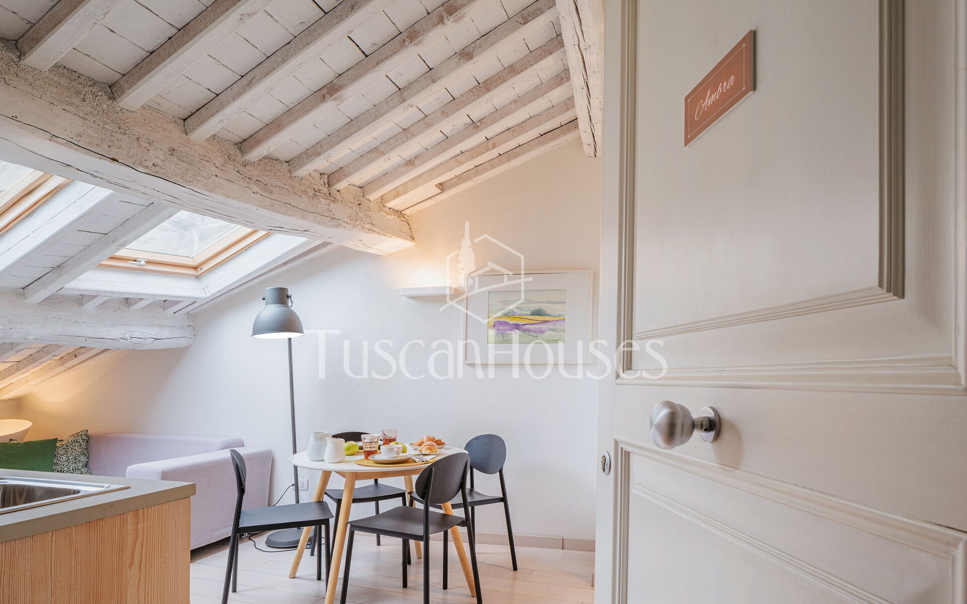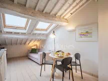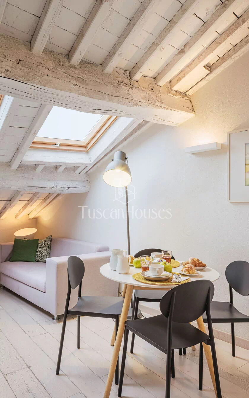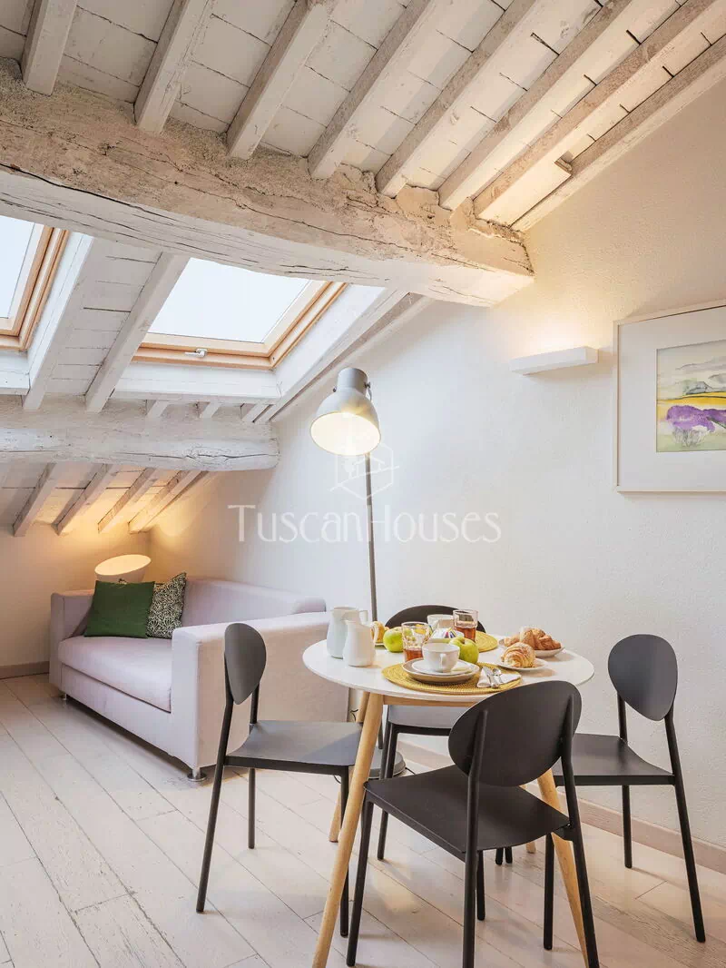 Ambra is a cozy attic apartment located on the third and top floor of the Residenza degli Artisti, a building recently renovated and furnished with taste under the supervision of a renowned Italian designer. Guests will immediately appreciate the bright and refined atmosphere, enhanced by the charming white wooden beam ceilings.