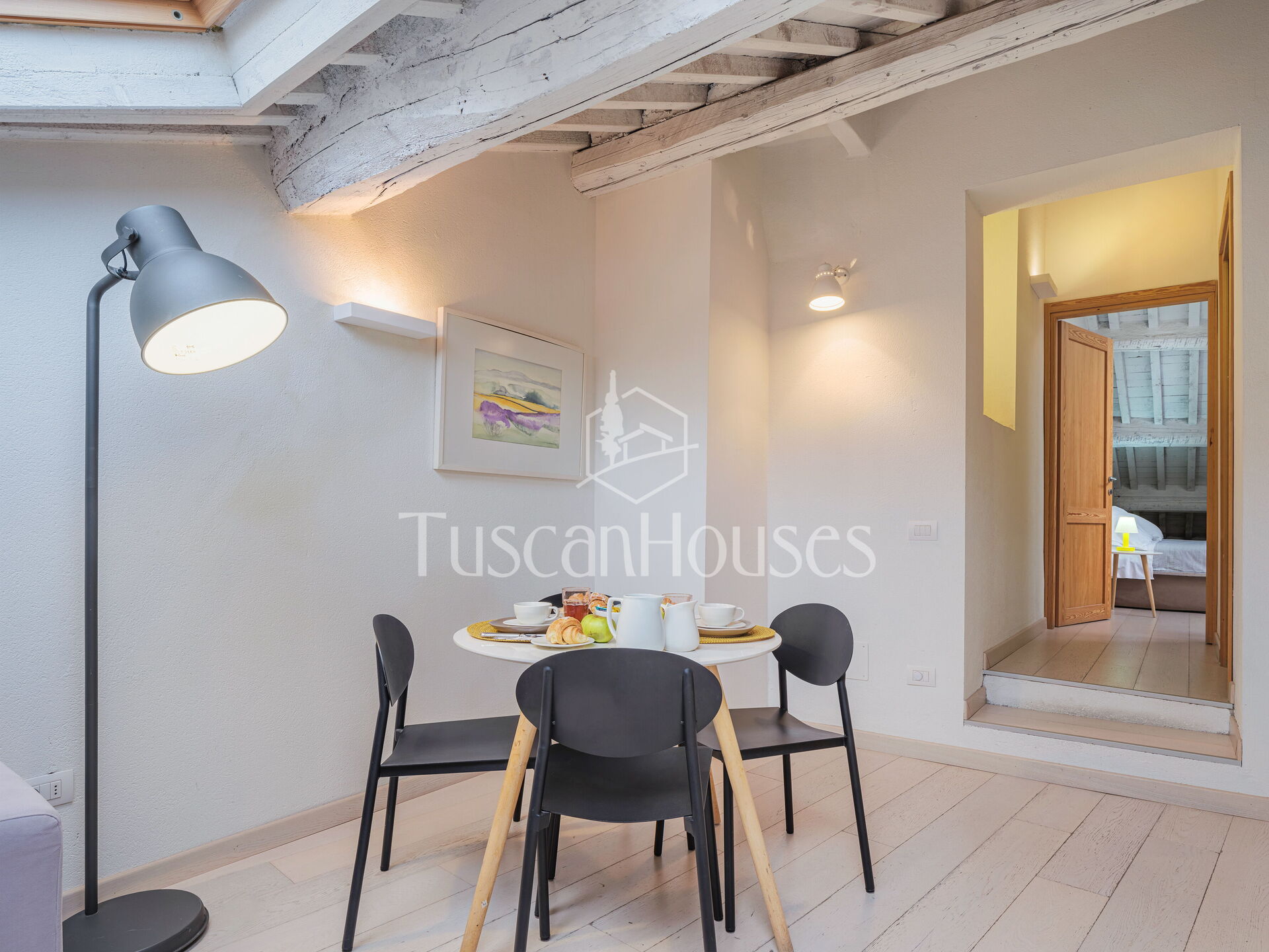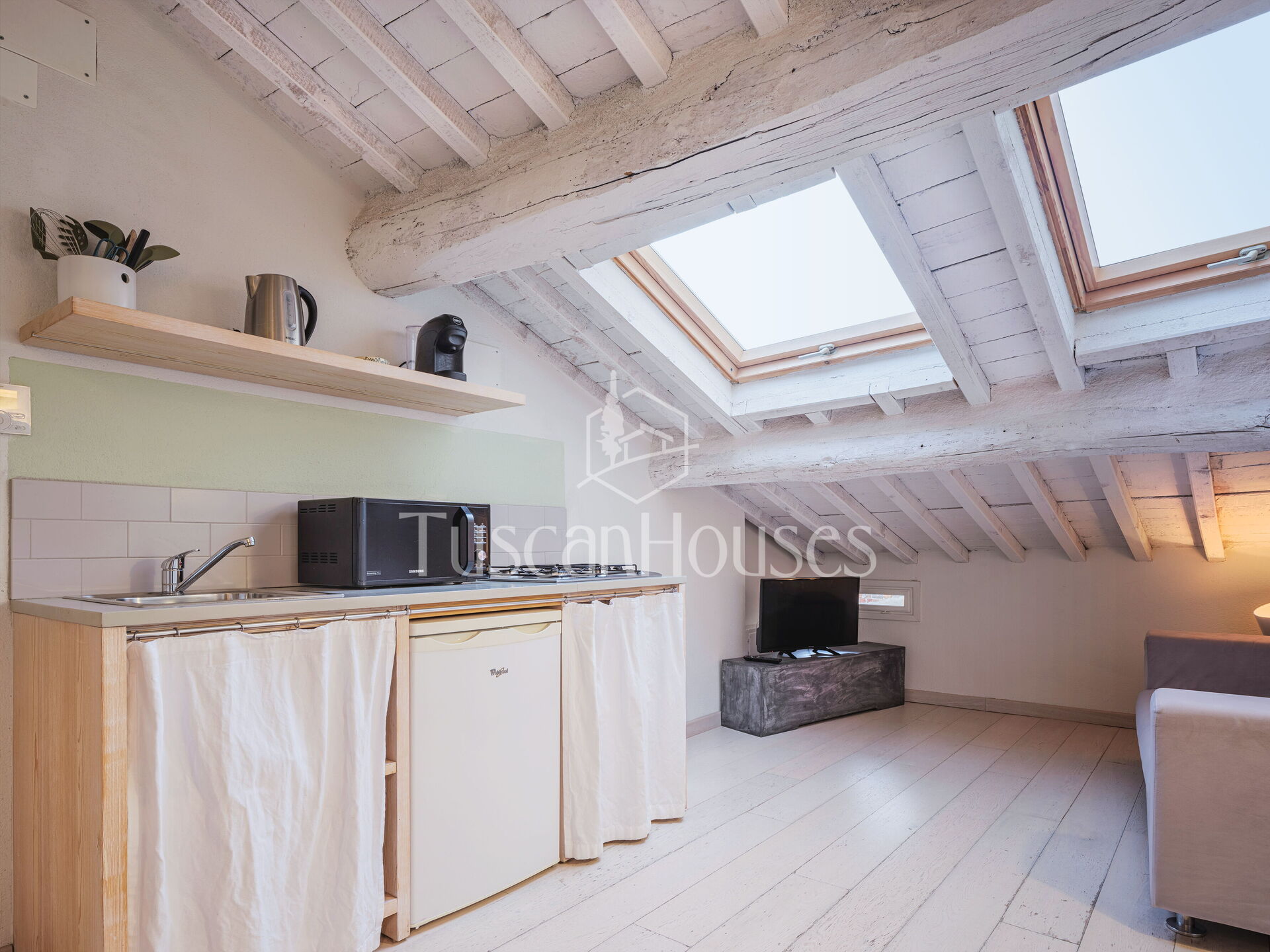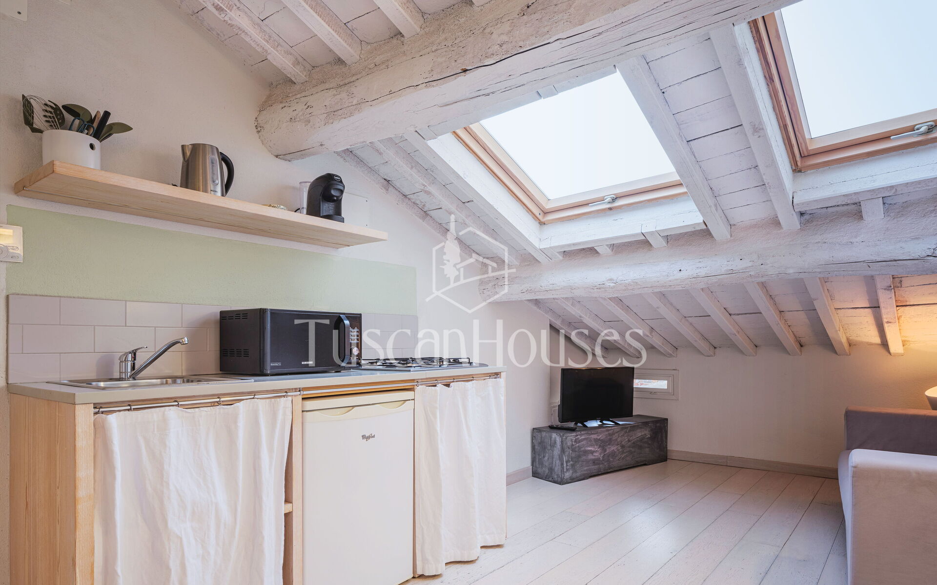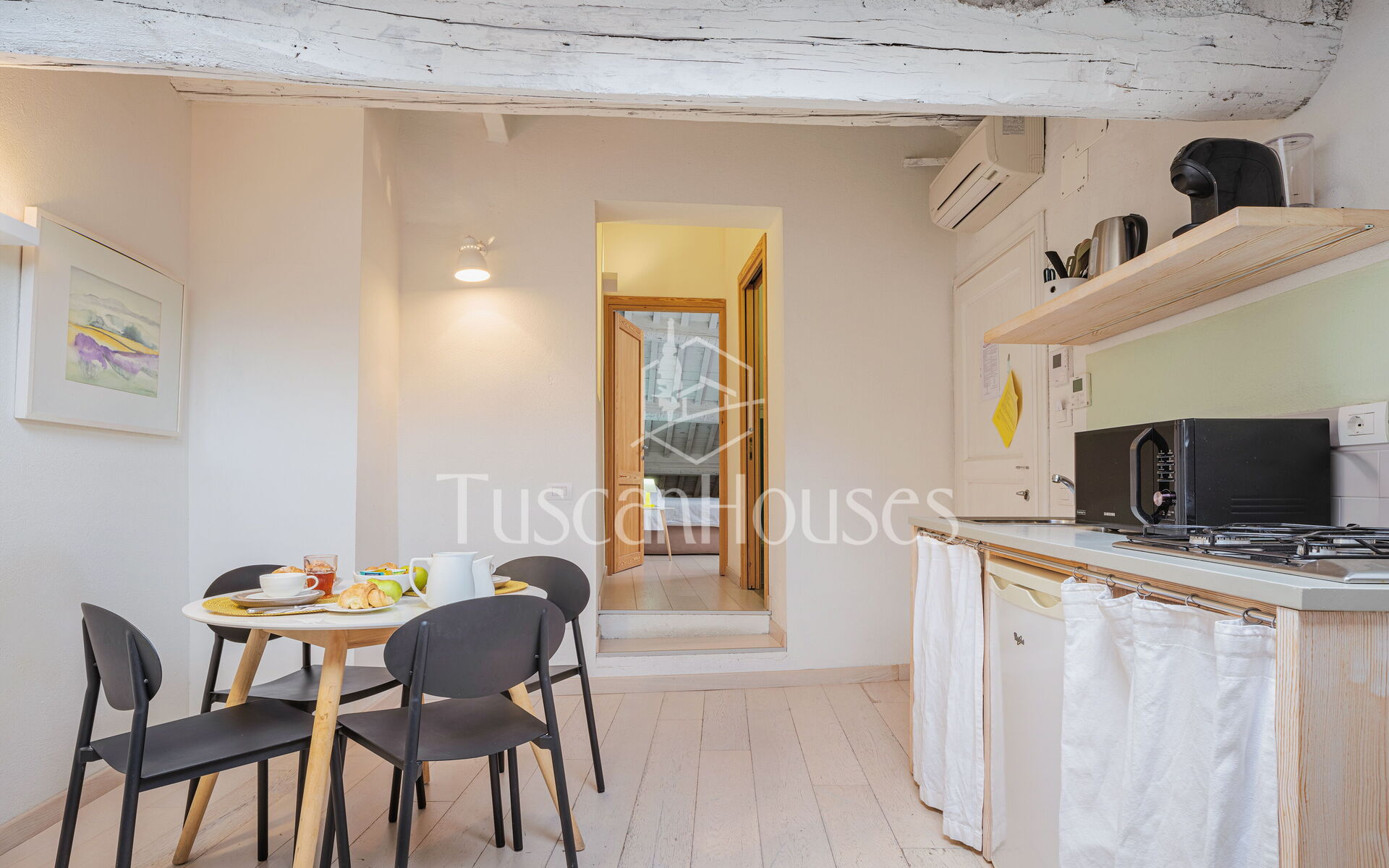 Ambra is a cozy attic apartment located on the third and top floor of the Residenza degli Artisti, a building recently renovated and furnished with taste under the supervision of a renowned Italian designer. Guests will immediately appreciate the bright and refined atmosphere, enhanced by the charming white wooden beam ceilings.