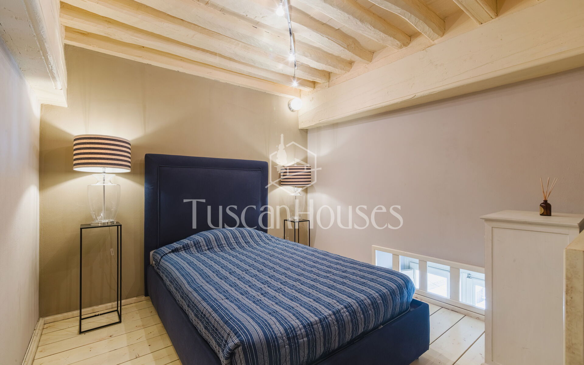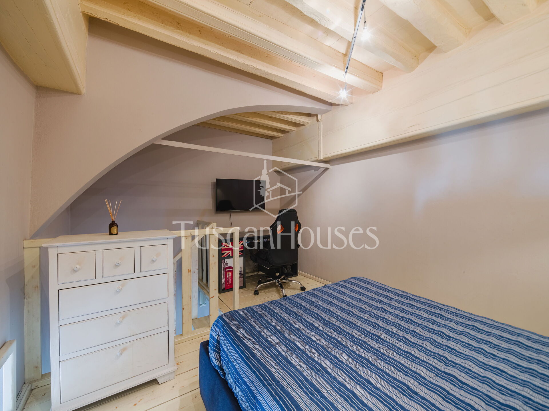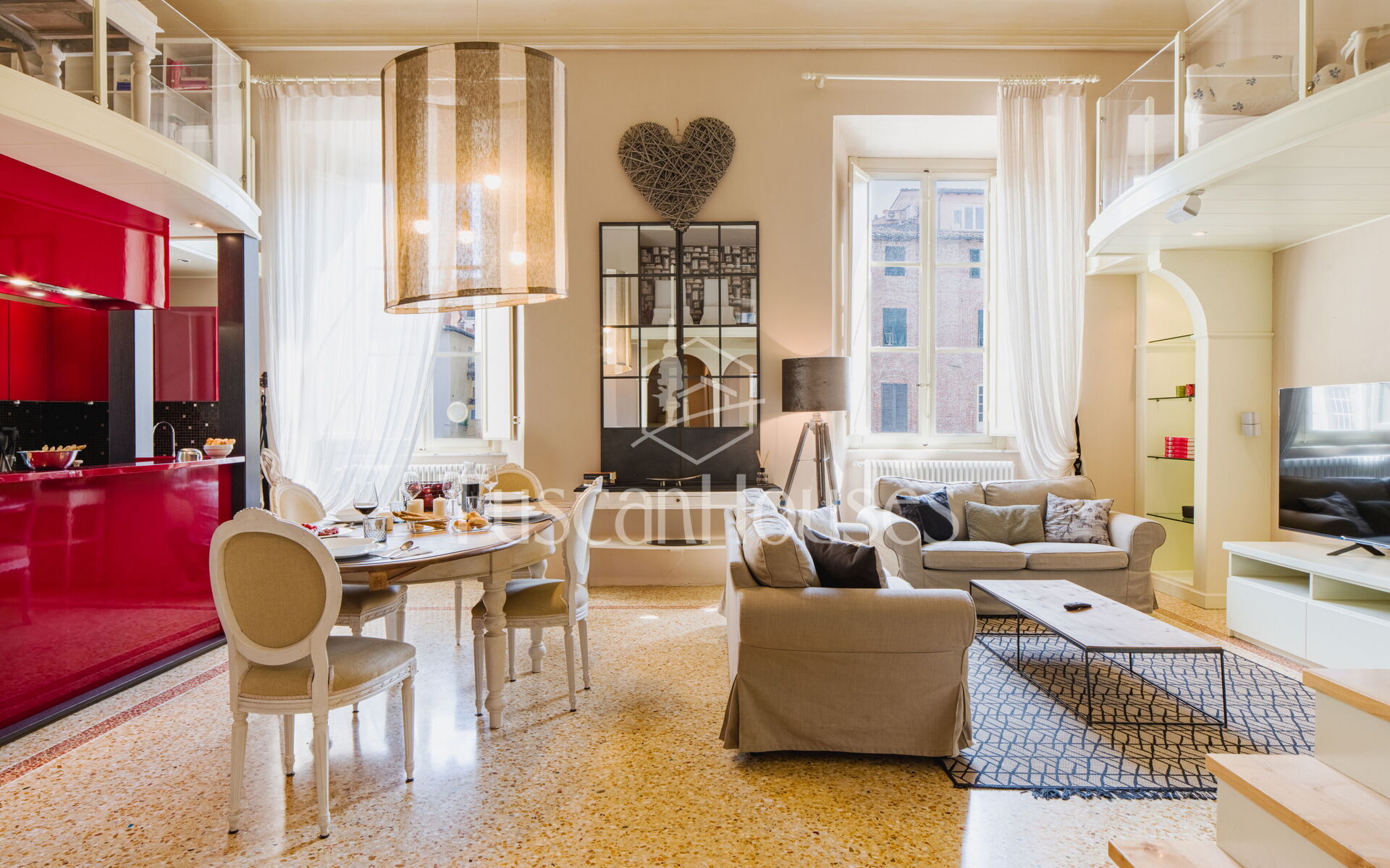 The entrance opens onto a spacious living area with a dining zone and a fully equipped kitchenette. The windows overlook the charming Piazza del Carmine:, once the site of the town’s bustling market, now a tranquil square where locals gather to stroll and enjoy the atmosphere.