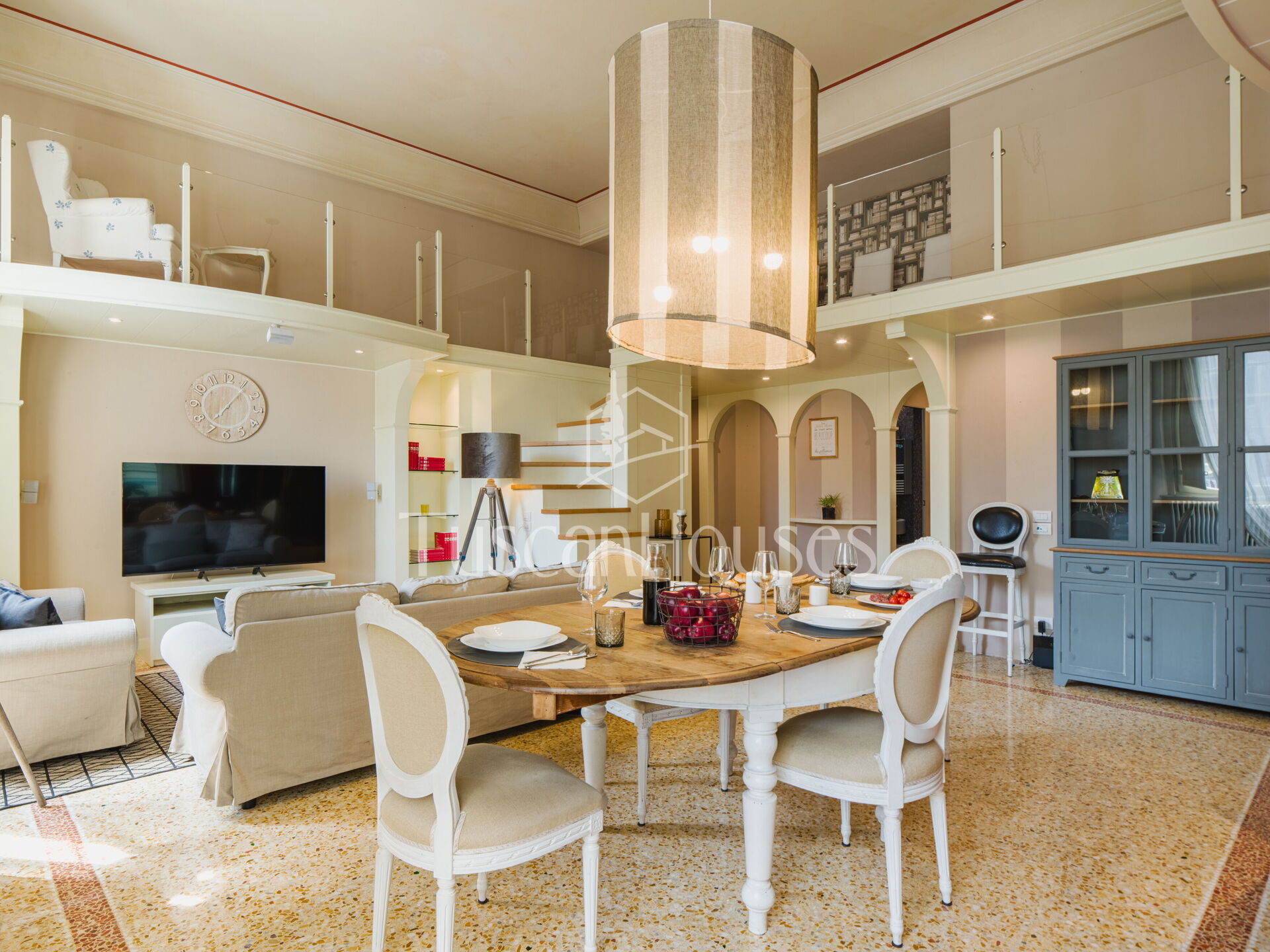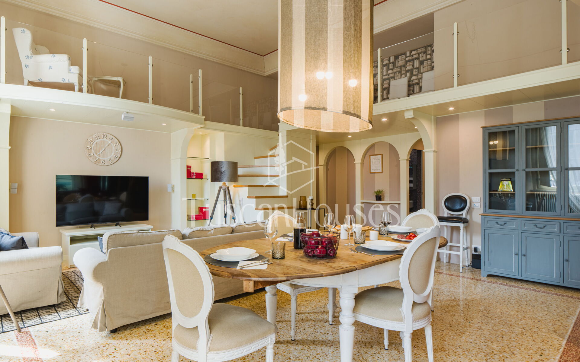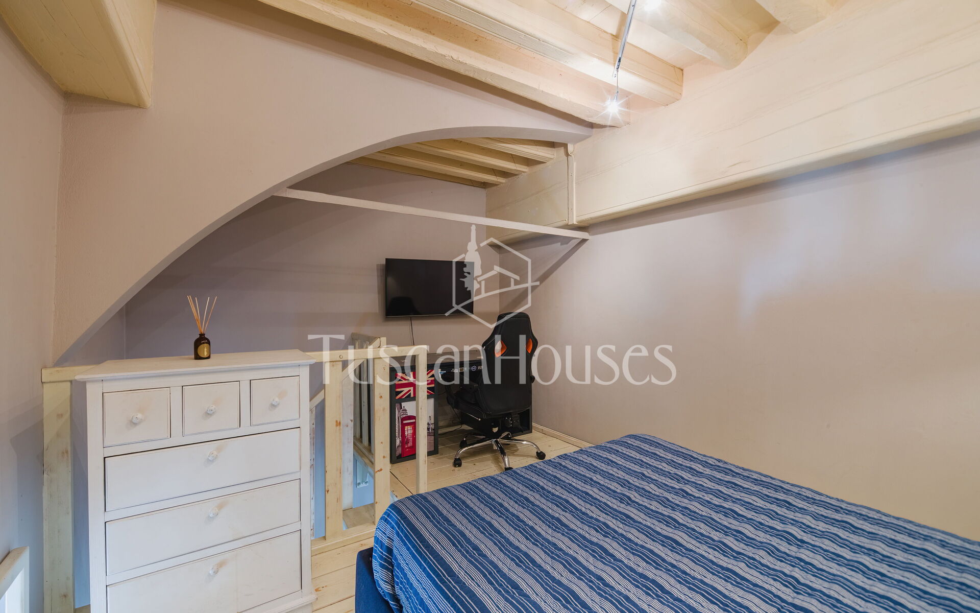 The entrance opens onto a spacious living area with a dining zone and a fully equipped kitchenette. The windows overlook the charming Piazza del Carmine:, once the site of the town’s bustling market, now a tranquil square where locals gather to stroll and enjoy the atmosphere.