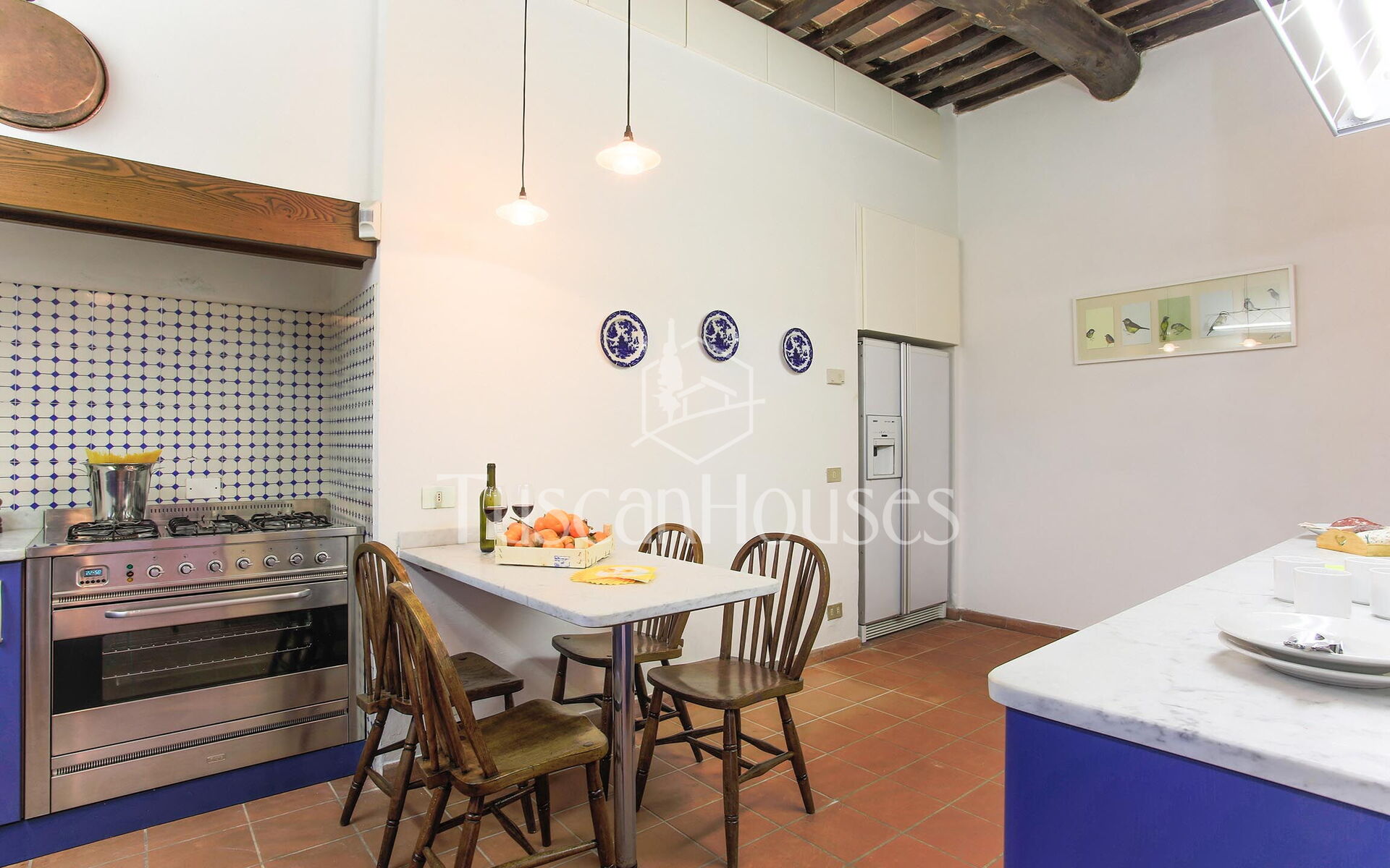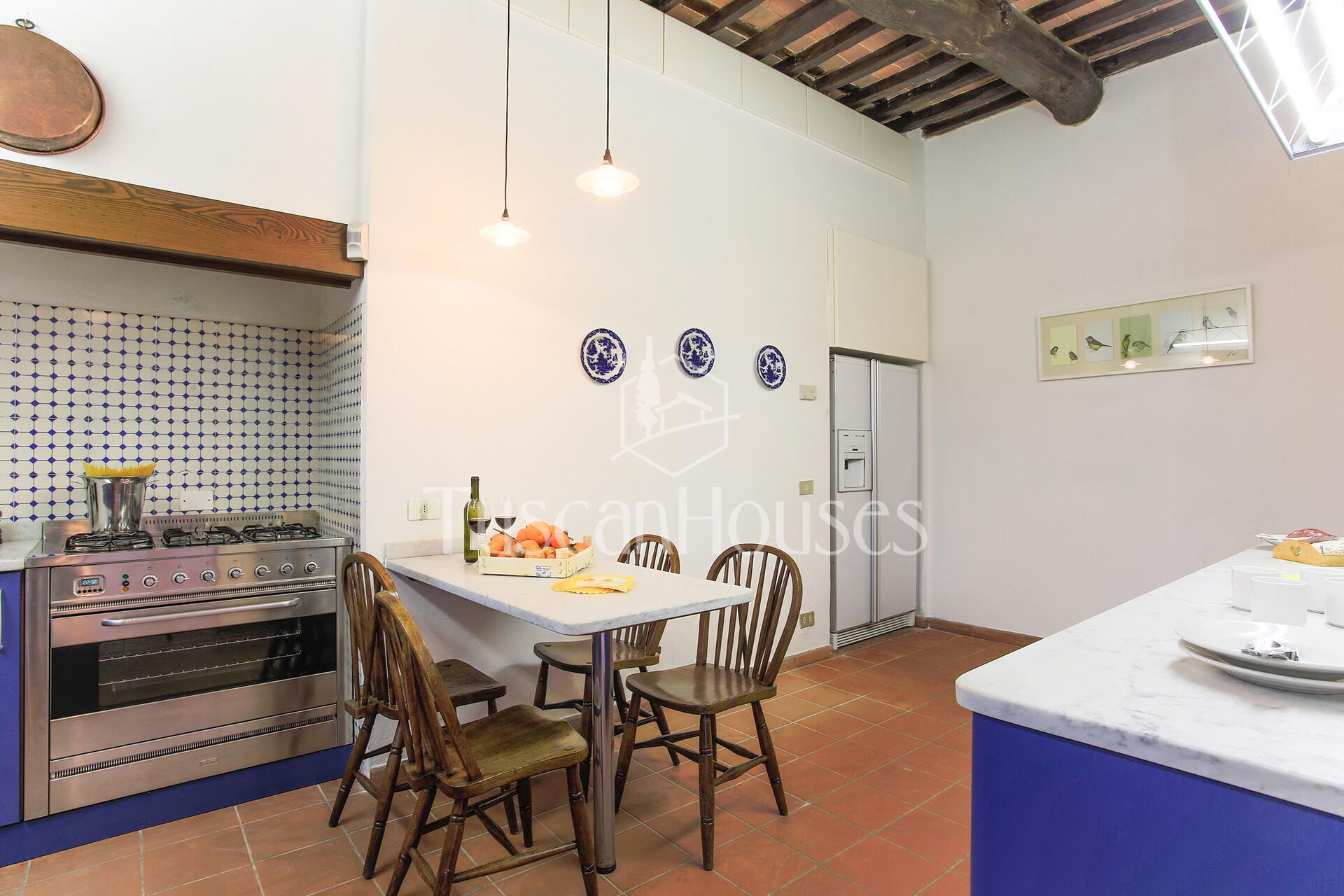 A fully equipped kitchen with a large dining table