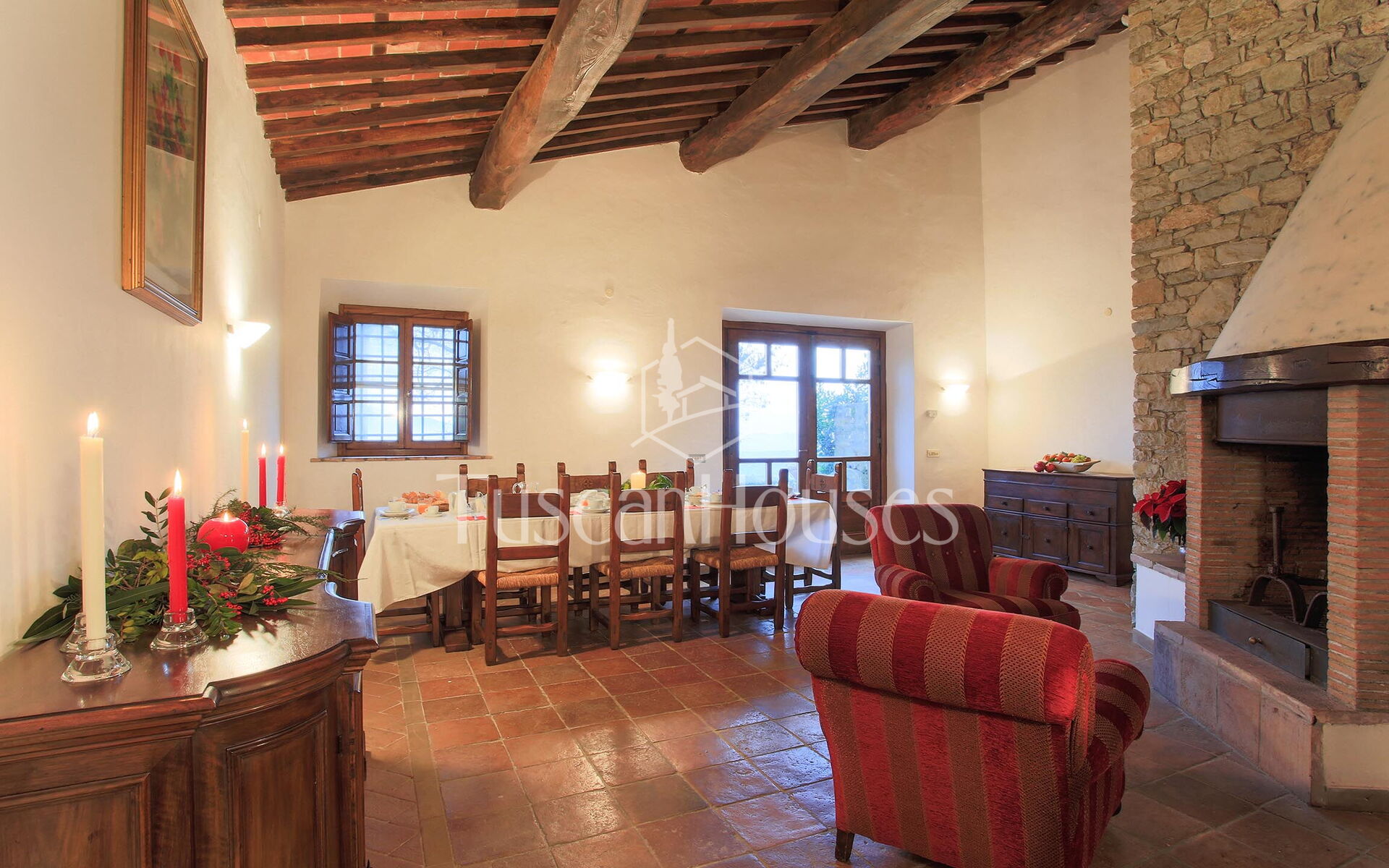 Fireplace, Well Equipped Kitchen, Sofa, Oven, Freezer, Fridge, Internet, WiFi Internet, Dishwasher, Italian Coffee Machine, American Coffee Machine, Microwave, Stove Top, 2 Armchair, Dining Table, Exit to the garden