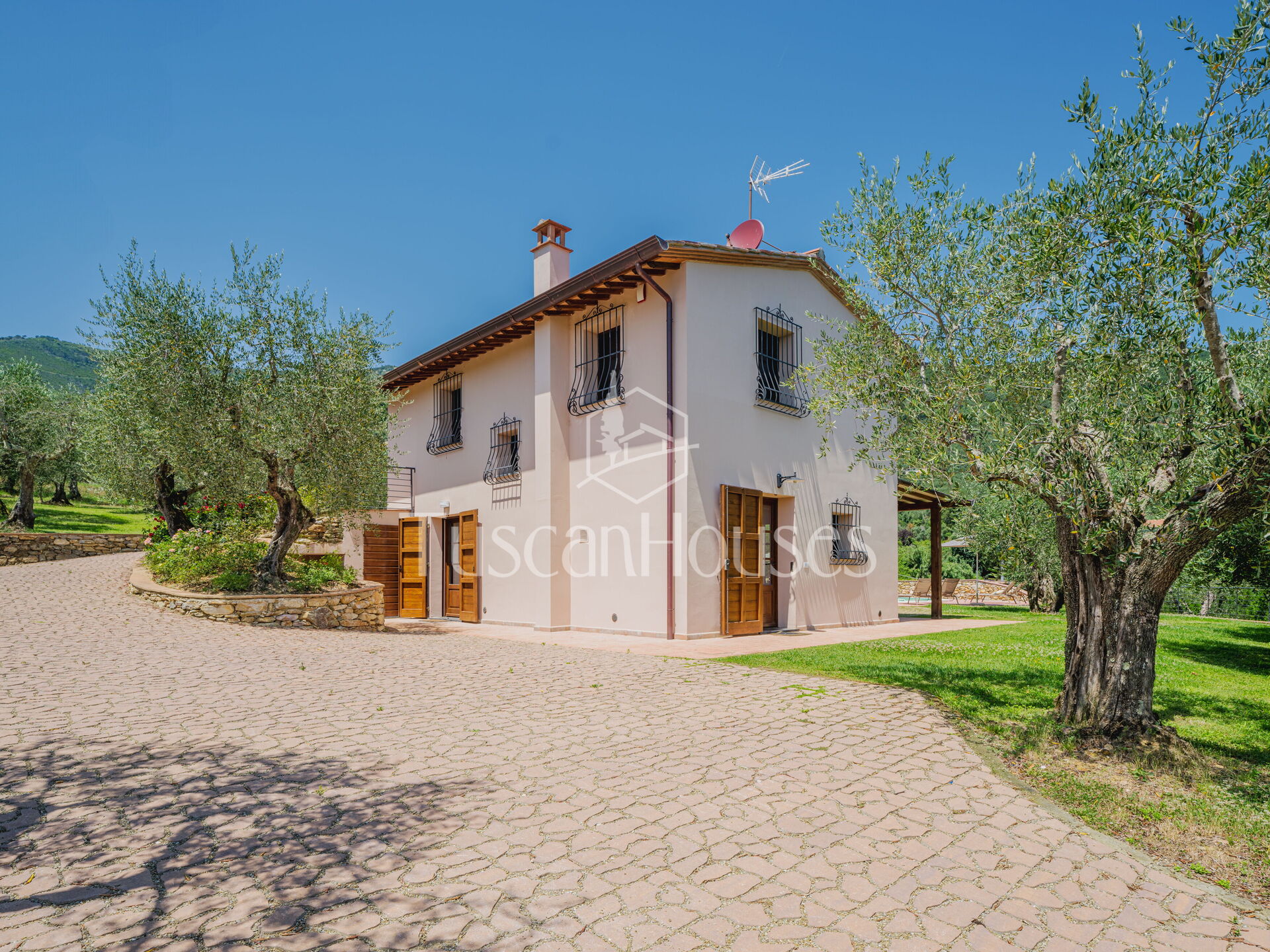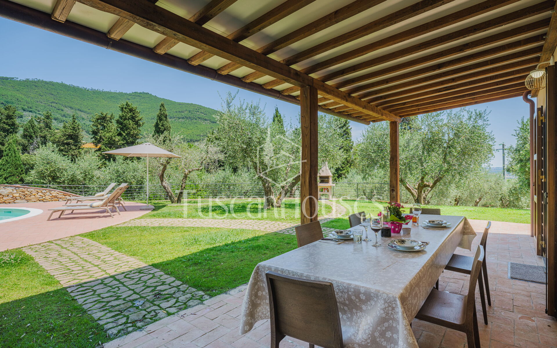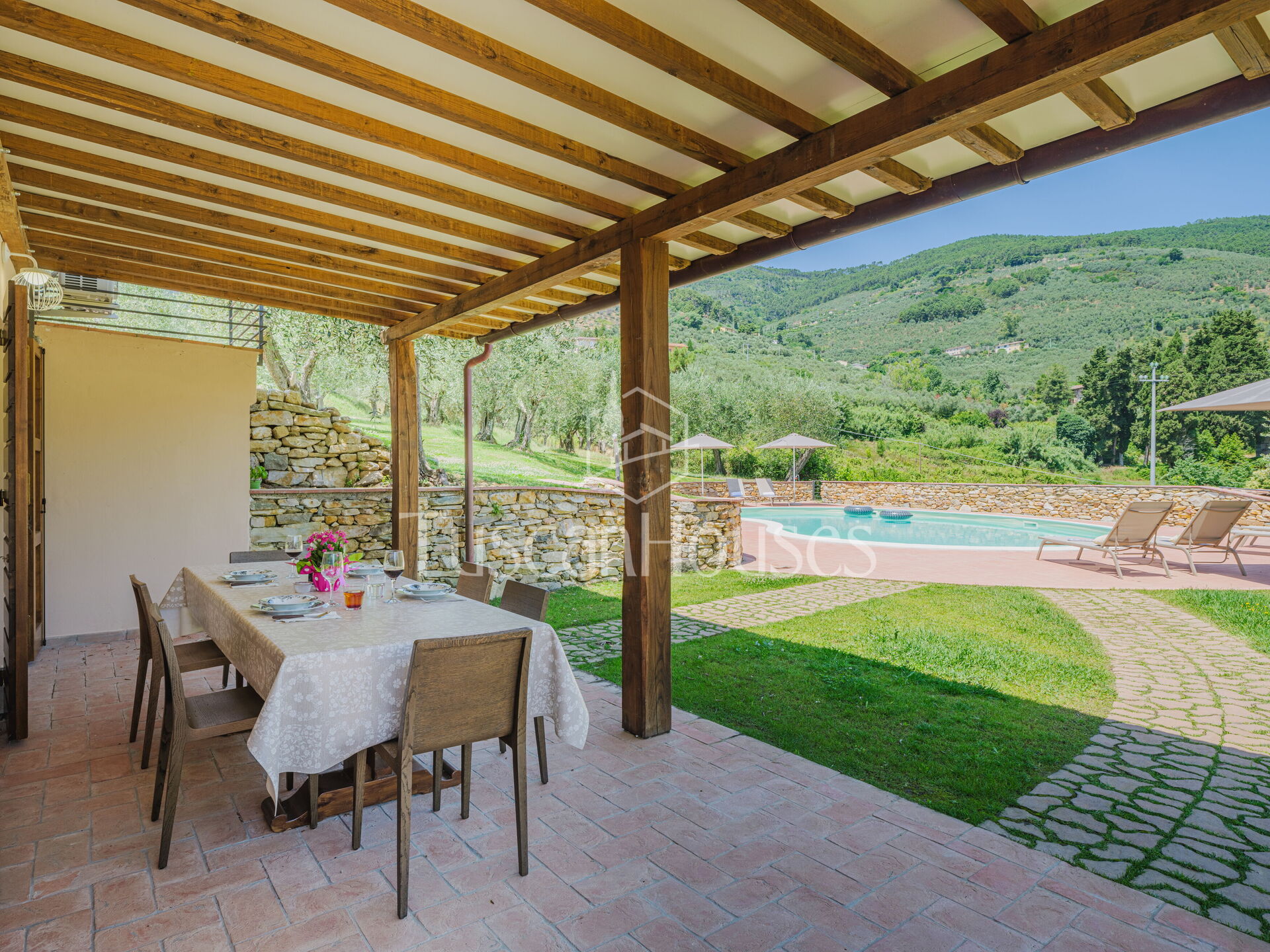 The house is embraced by a spacious terraced garden spanning one hectare, offering panoramic views of the surrounding hills. Adjacent to the living room, you will find a covered terrace, complete with a table and chairs, perfect for enjoying delightful al fresco dinners while overlooking the picturesque valley.