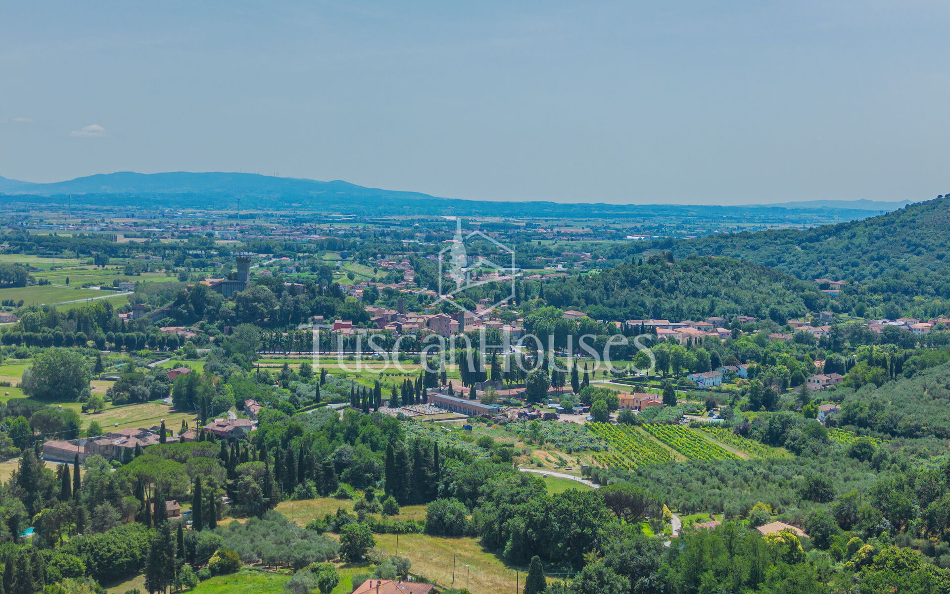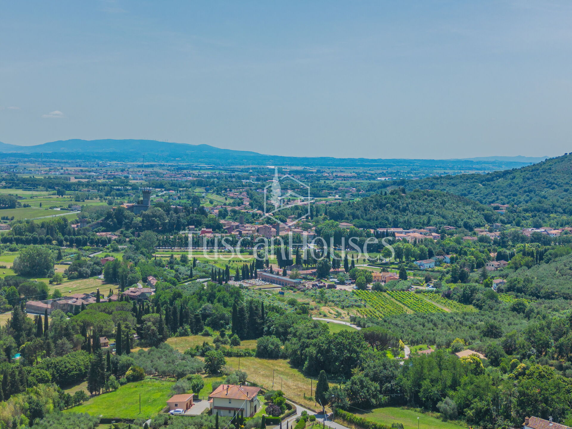 A highlight of the property is the private pool, strategically positioned to capture the breathtaking views of the Pisa and Livorno hills, as well as the Bientina valley. The pool, located in the garden just in front of the house and on the same level, boasts an appealing bean shape and a fixed depth of 1.40 meters. It is lined with blue PVC and maintained with a chlorine-based purification system. The pool area is thoughtfully furnished with comfortable sun loungers and umbrellas, inviting you to relax and bask in the sun. Additionally, a convenient shower is available for your use