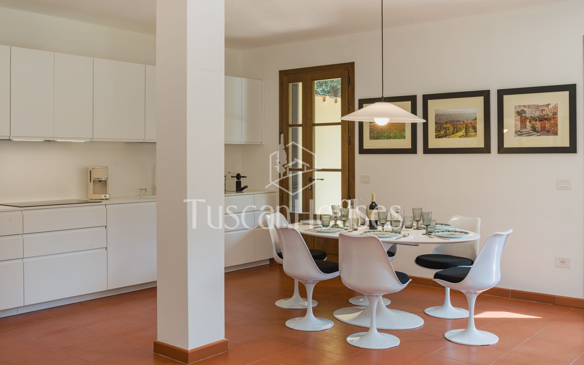 Spacious entrance hall separating the living area from the large, well-equipped kitchen, which is directly connected to the outdoor veranda, ideal for enjoying meals together al fresco.